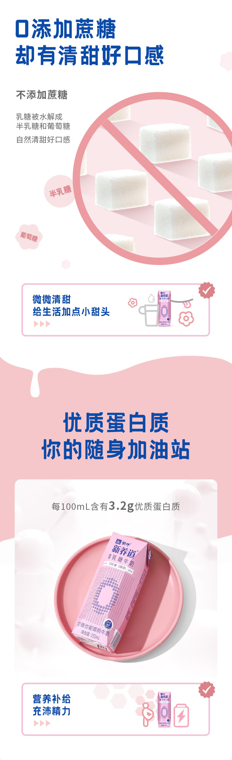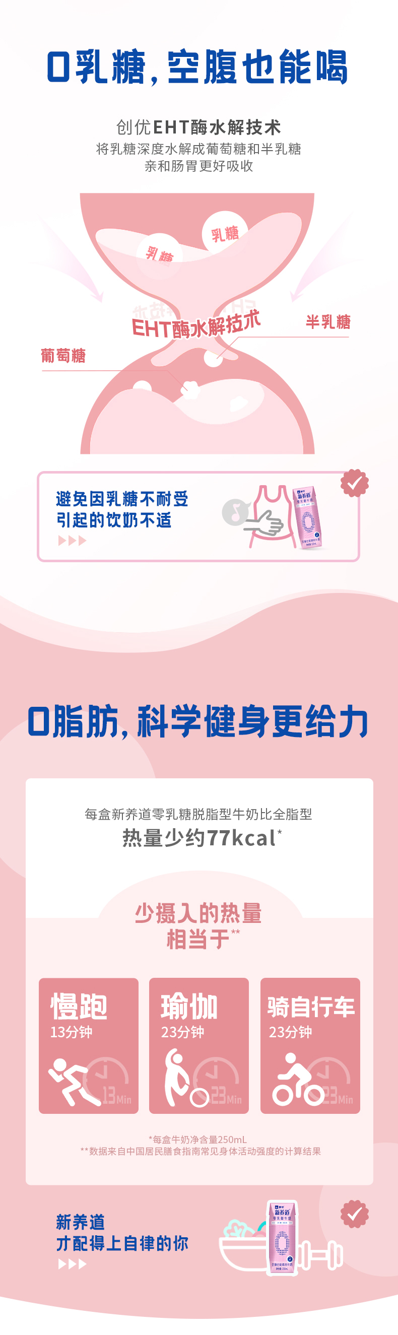 蒙牛新养道 零乳糖脱脂型牛奶,创优EHT酶水解技术将乳糖深度水解成葡萄糖和半乳糖,亲和肠胃更好吸收,避免因乳糖不耐受者引起的饮奶不适,不添加蔗糖、每100ml含有3.2g优质蛋白、脱脂型减少约77kcal热量,相当于慢跑13分钟、瑜伽23分钟,适合有减肥需求、控制热量摄入人群。