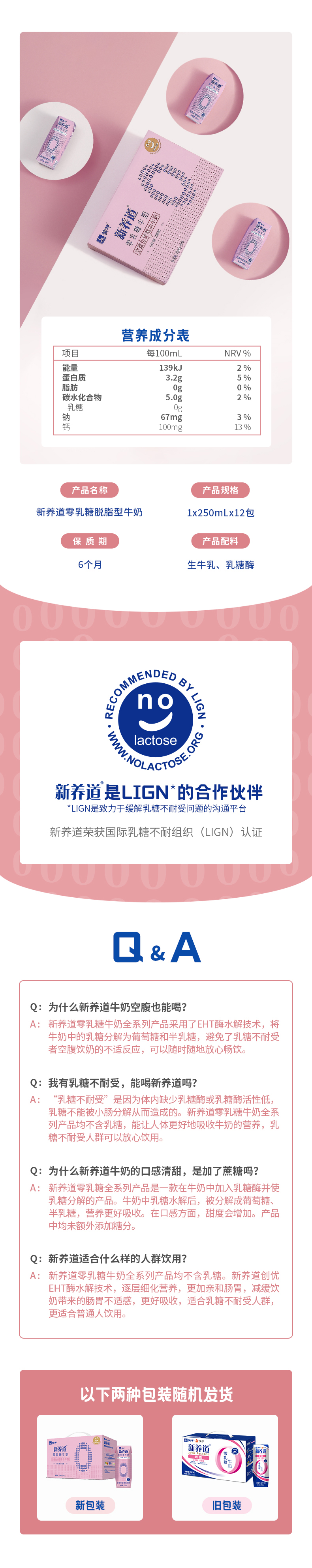 新养道是内蒙古蒙牛乳业(集团)股份有限公司推出的一款专业乳制品,新养道零乳糖牛奶产品是基于中国人体内普遍缺乏“乳糖酶”的现状而定制的营养牛奶,通过专业EHT酶水解技术,将乳糖分解为葡萄糖和半乳糖在水解的同时能很好地保留牛奶营养成分,帮助更好地吸收营养,乳糖酶的缺失不仅直接导致乳糖的不消化,同时还将可能造成牛奶中钙、铁、锌等多种营养成分的流失。