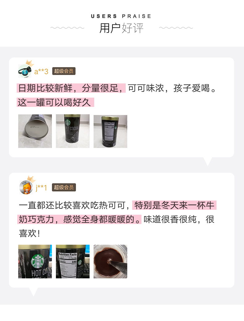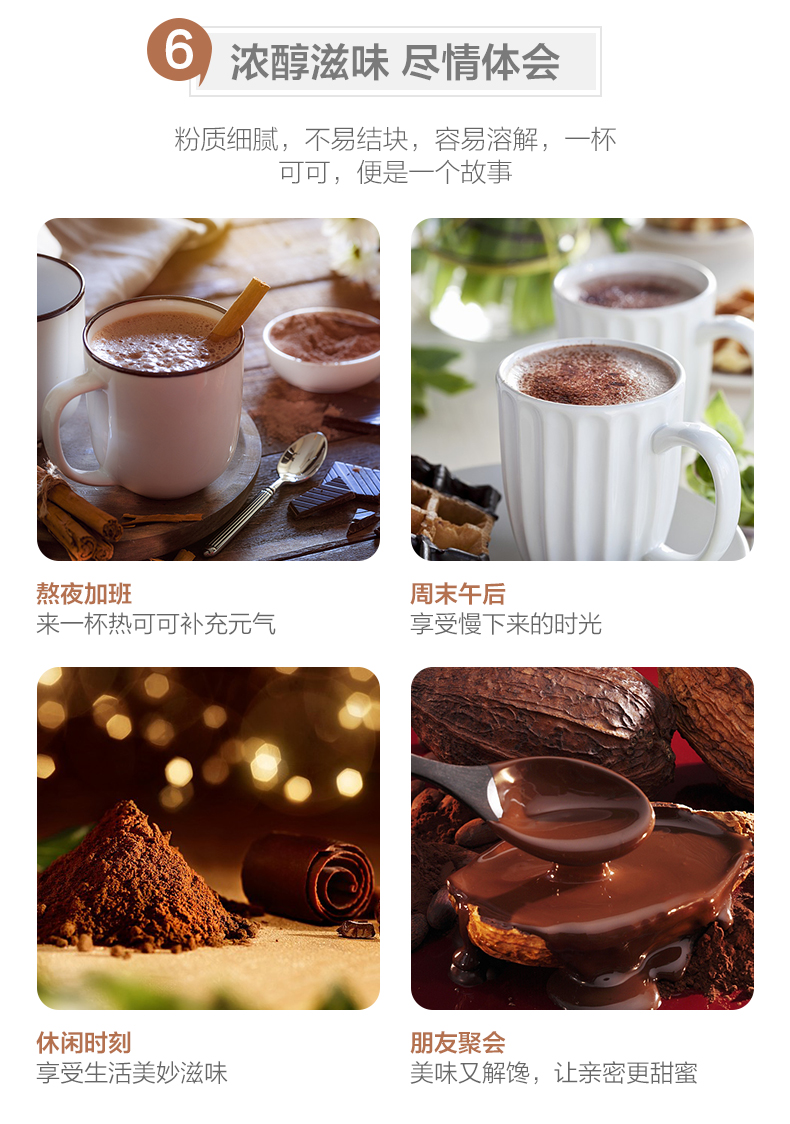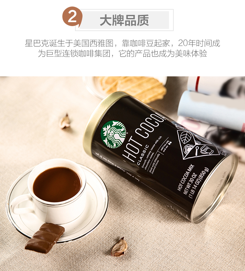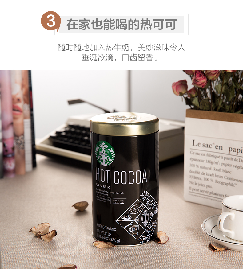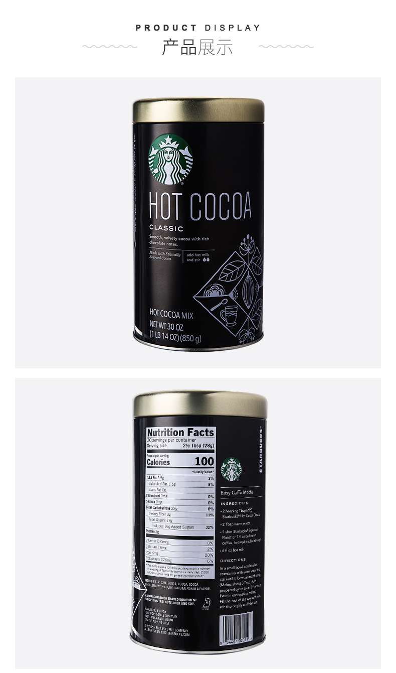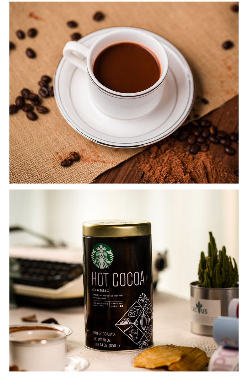 Starbucks星巴克经典原味热可可巧克力粉,采用荷兰可可豆制成精致巧克力粉,随时随地兑热水即可冲出一杯和店里一样的味道,用来烘焙,DIY甜品还是冲饮都是非常好的选择。直接用两勺加上热牛奶,一杯天鹅绒般丝滑的热可可就热乎乎做成啦,超方便!热可可抗氧化能力是红酒两倍,绿茶的三倍,不仅美味,还能促进血液循环支持心脏血管健康,提高思维能力。