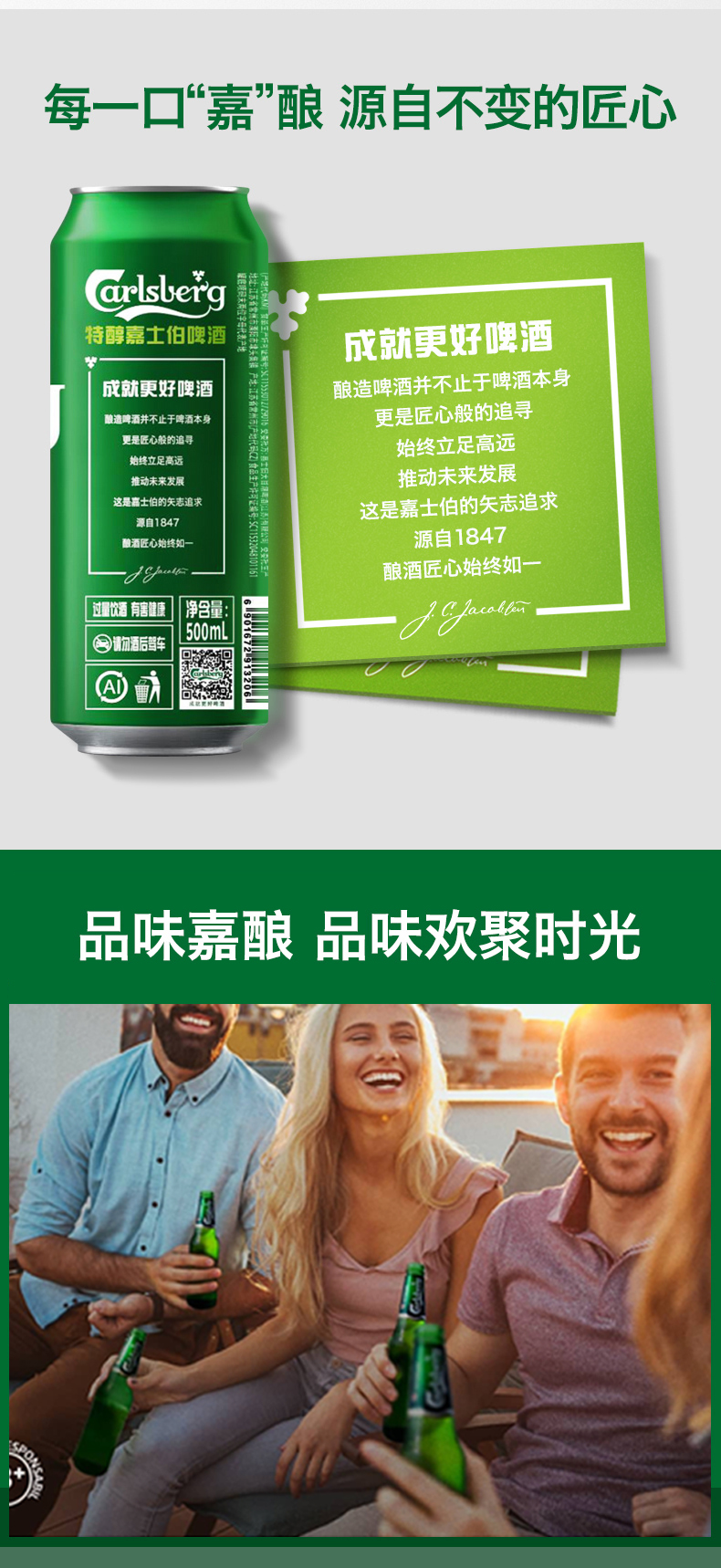 嘉士伯是丹麦著名的啤酒品牌,从1904年开始,被丹麦皇室指定为御用啤酒,其商标上多了一个皇冠的标志,这在国外是很高的荣誉了,特醇嘉士伯啤酒,精选优质小麦,口感香醇顺滑,让你一喝上瘾~丰富泡沫。