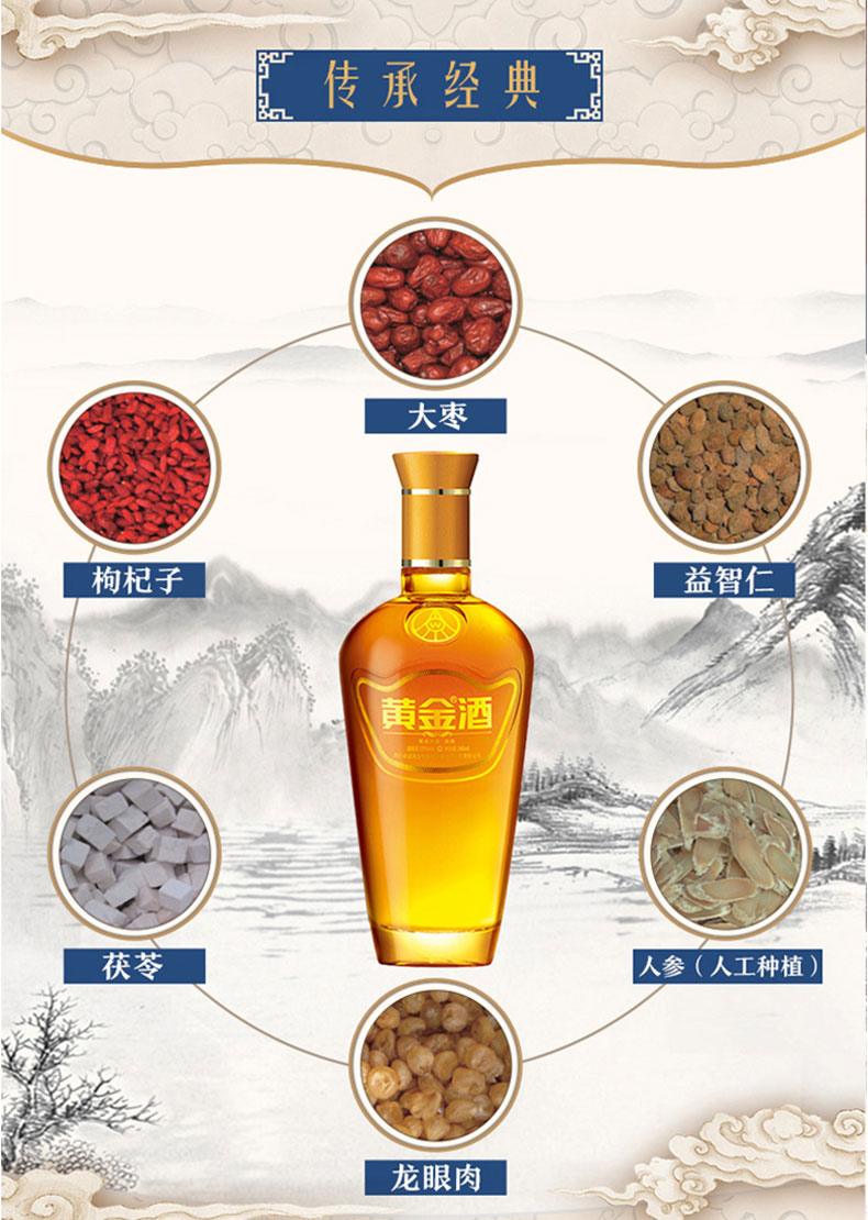 这款黄金酒使用优质基酒,遵循四百余年中医古方,精选老龟甲、鹿茸、枸杞、杜仲、蜂蜜等药材,酿造出代表作——“黄金酒”。35度“黄金酒”色如琥珀、酒香浓郁、回味无穷。