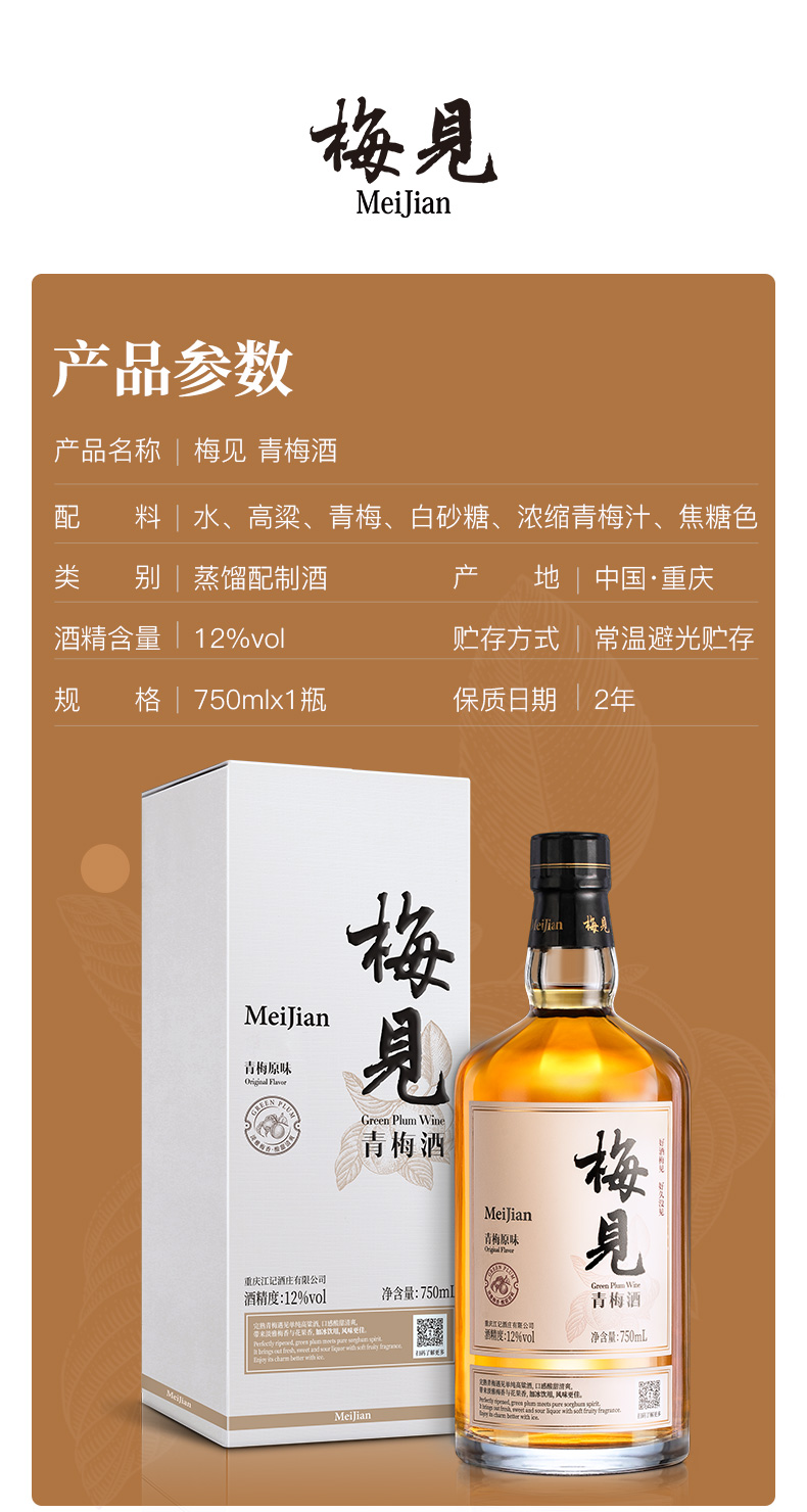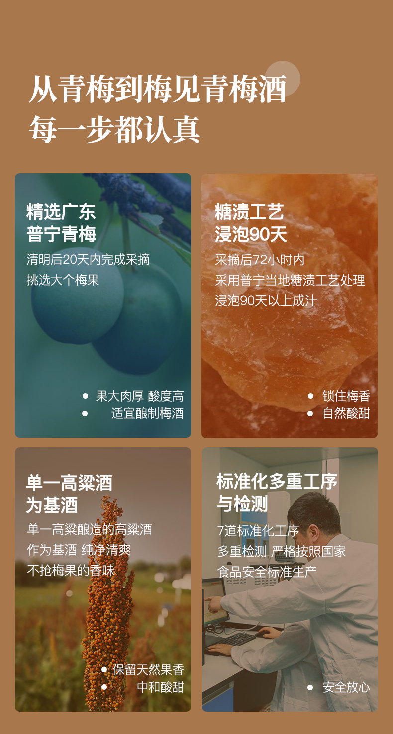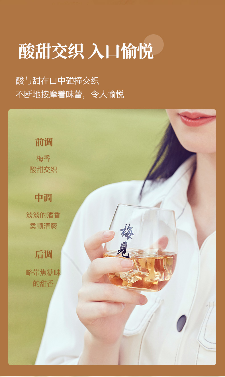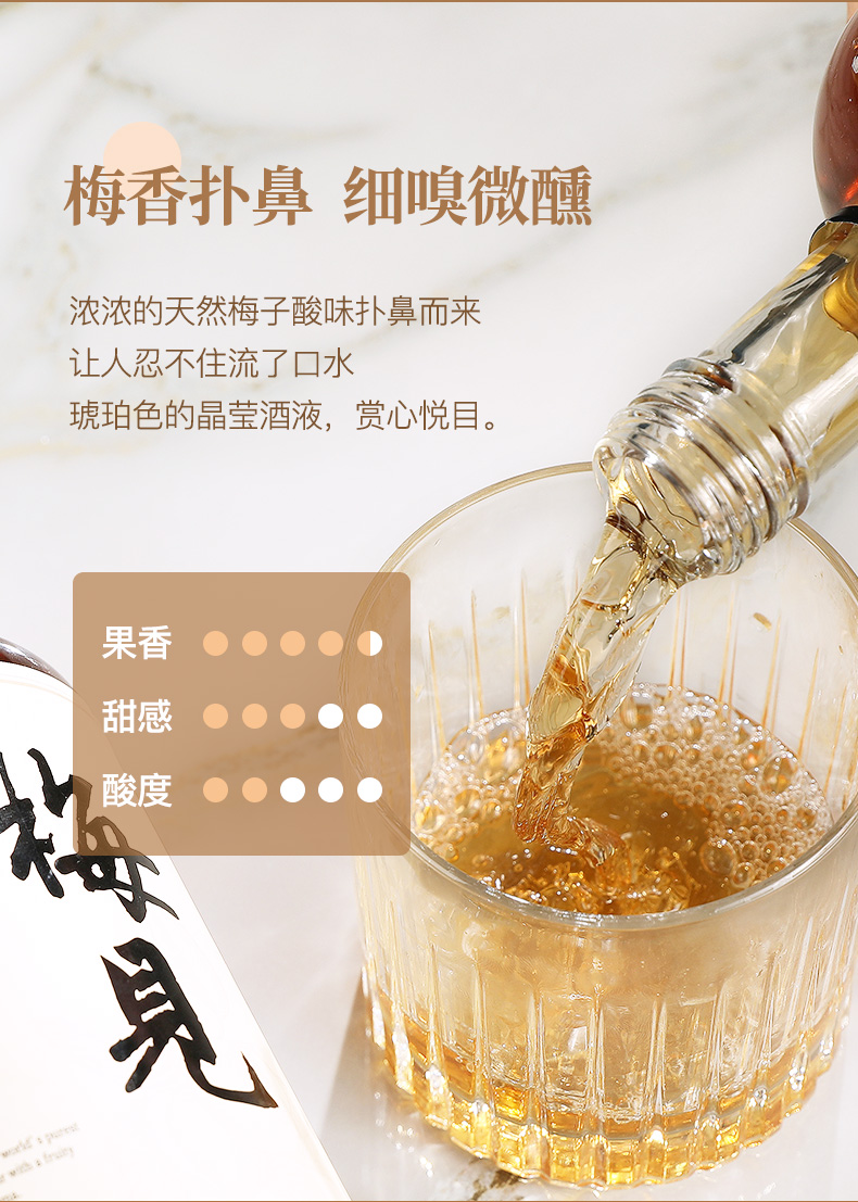 酿制方面:采用国家地理标志认证的普宁青梅,精选过大肉厚青梅,遵循传统工艺,采摘后72小时内糖渍工艺处理,历经90天缓慢出汁,保留纯粹青梅滋味。选用单一高粱酿造的高粱酒作为基酒跟其他白酒比起来口感更纯净,杂味更少,能更好的跟青梅融合,达到酸甜平衡没有杂味。