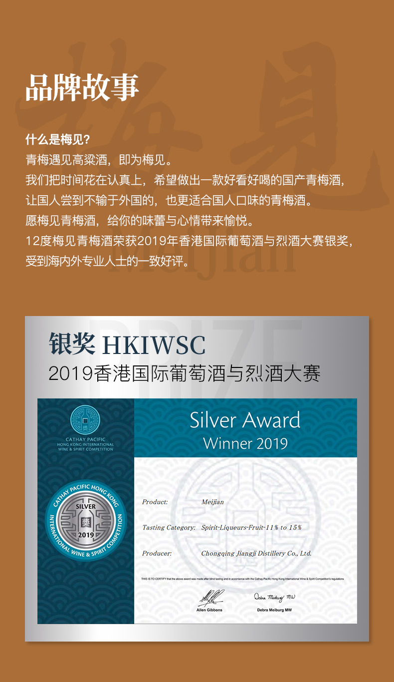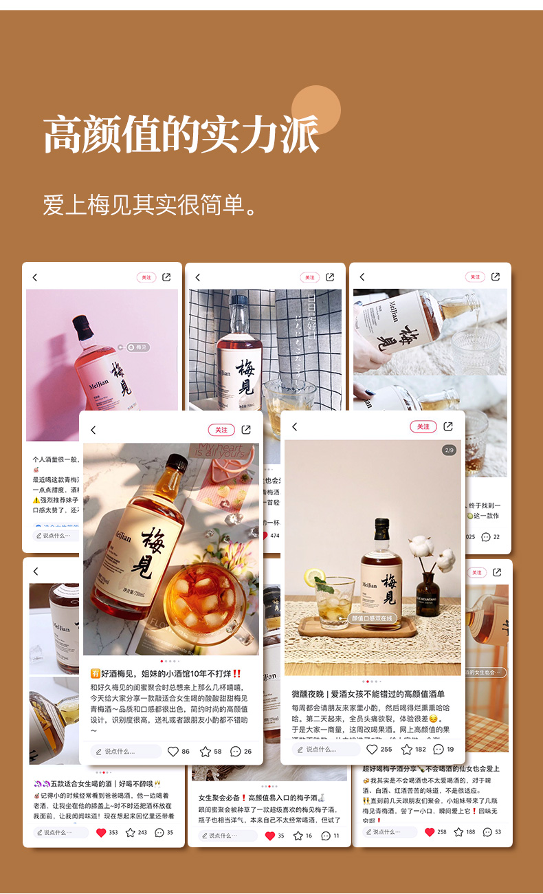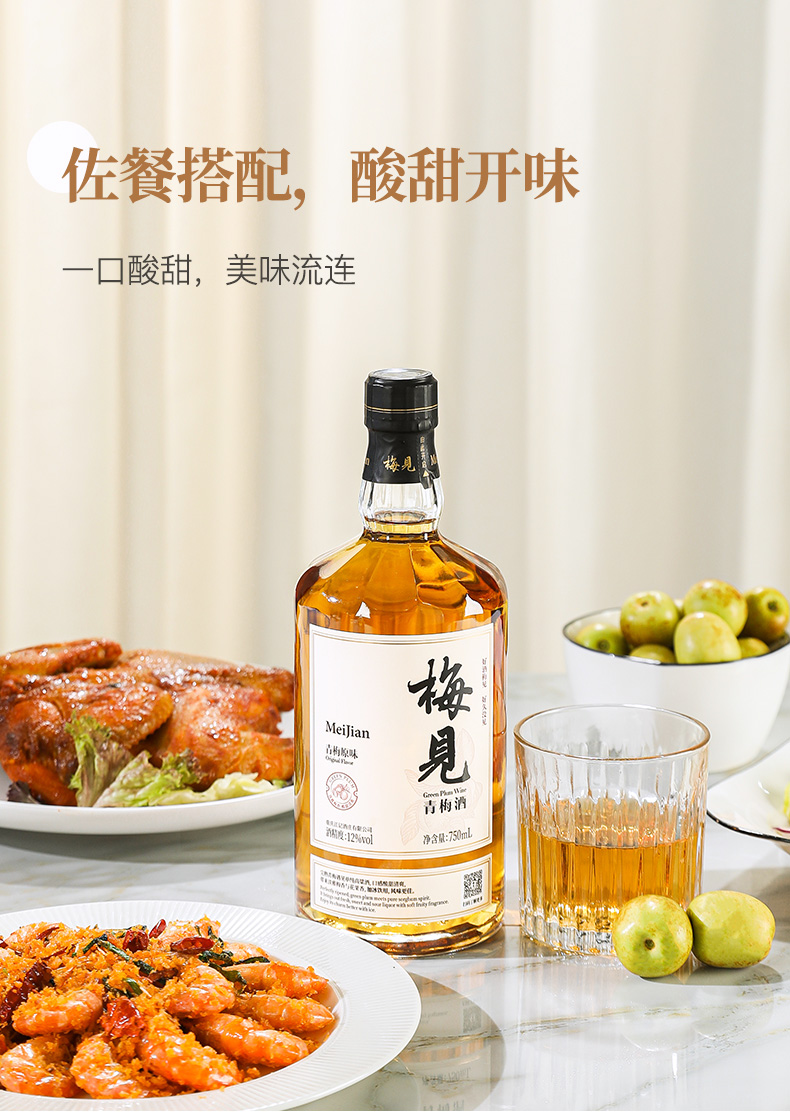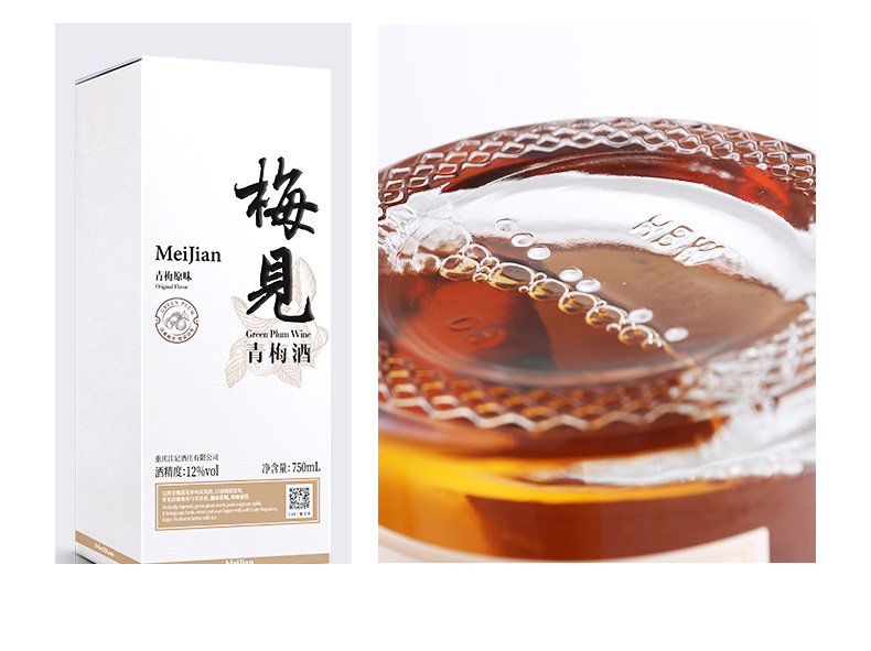 酿制方面:采用国家地理标志认证的普宁青梅,精选过大肉厚青梅,遵循传统工艺,采摘后72小时内糖渍工艺处理,历经90天缓慢出汁,保留纯粹青梅滋味。选用单一高粱酿造的高粱酒作为基酒跟其他白酒比起来口感更纯净,杂味更少,能更好的跟青梅融合,达到酸甜平衡没有杂味。