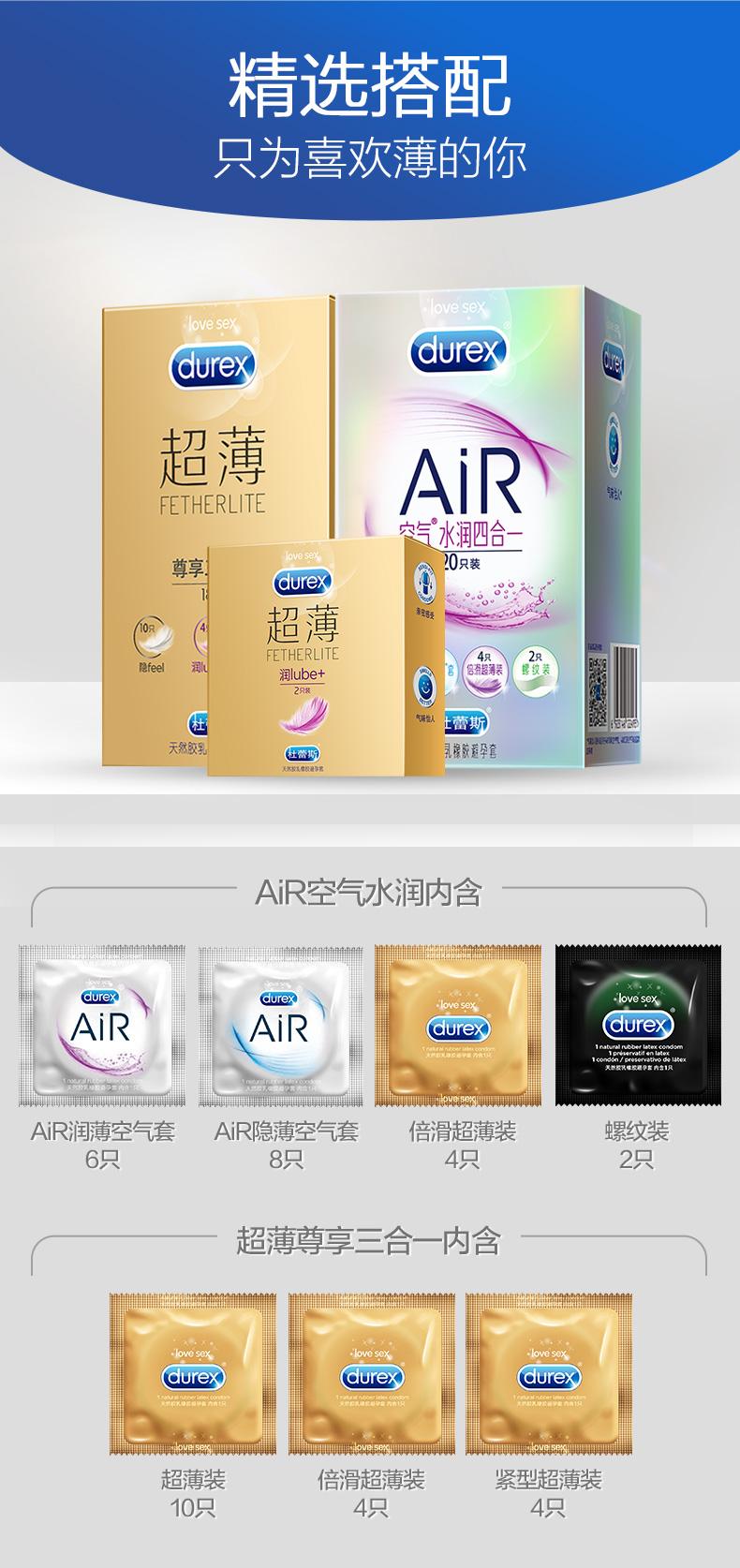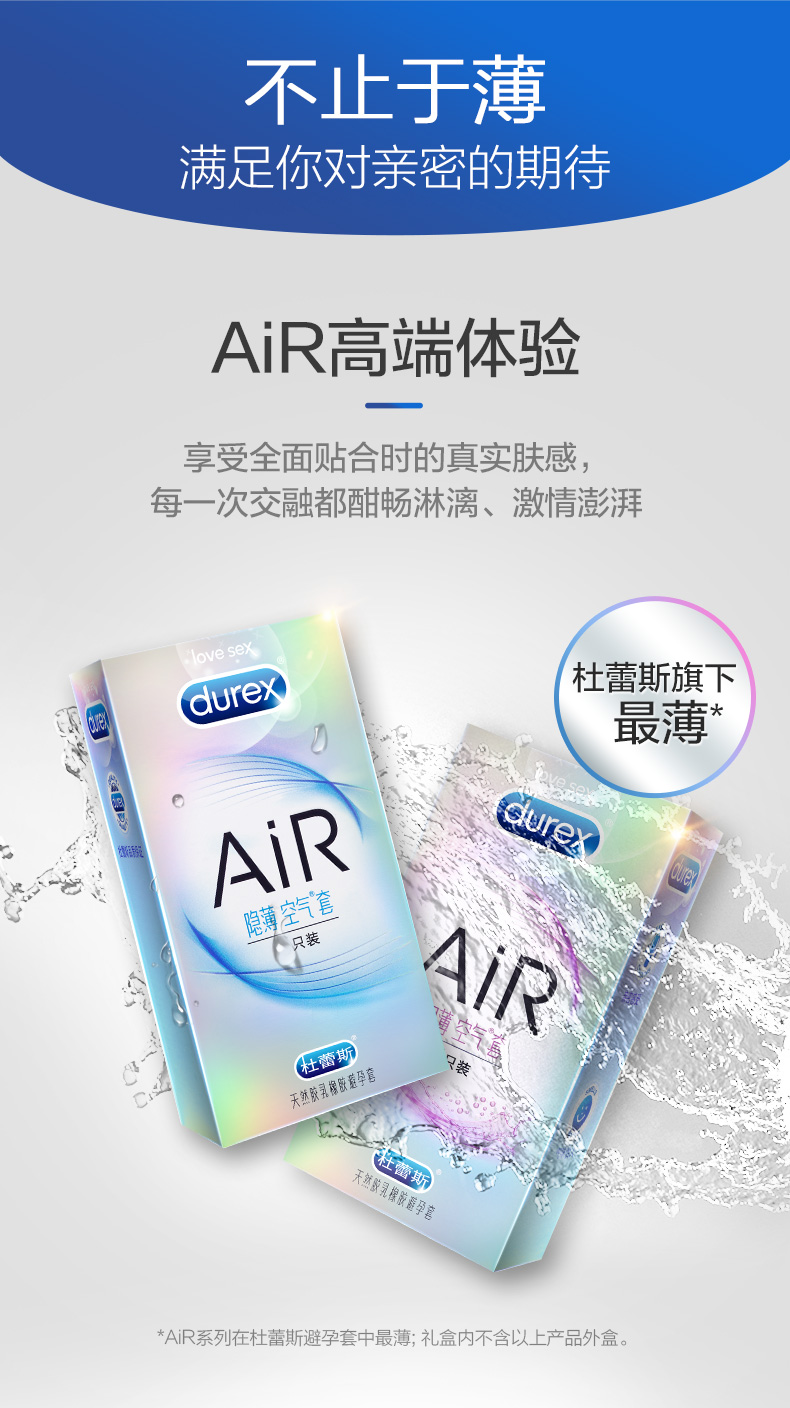 Air空气套,俗称空气套,全名杜蕾斯至薄幻隐装避孕套,属于杜蕾斯安全套亲密超薄系列新品之一,是目前杜蕾斯旗下最薄产品。空气套,极致薄,以其独特的柔薄舒适感而被众多追求性爱快感的男女人士所钟爱。