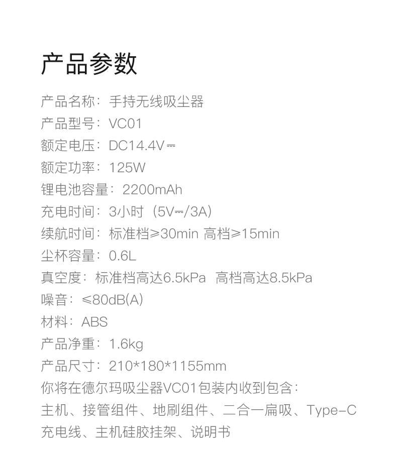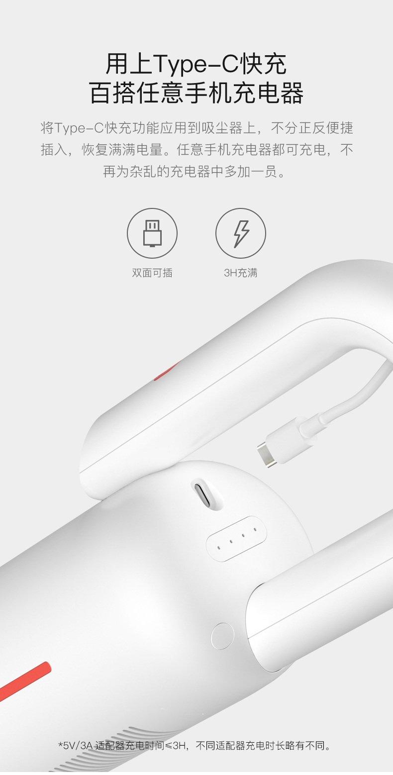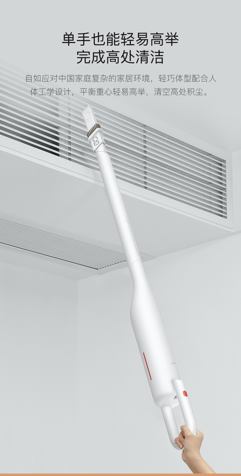 内置性能强悍的迷你电机,带动涡轮风叶瞬速带来高达8500Pa的风压,真空度可达8500Pa,相比上一代吸力提升约50%;实验搭配吸盘测试可轻松提起50斤箱子,配有二合一扁吸头、地刷、内置2200mAh锂电池,满电后能提供30分钟续航,无线使用更灵动,车载、电脑、充电宝可直接为其充电,非常方便。