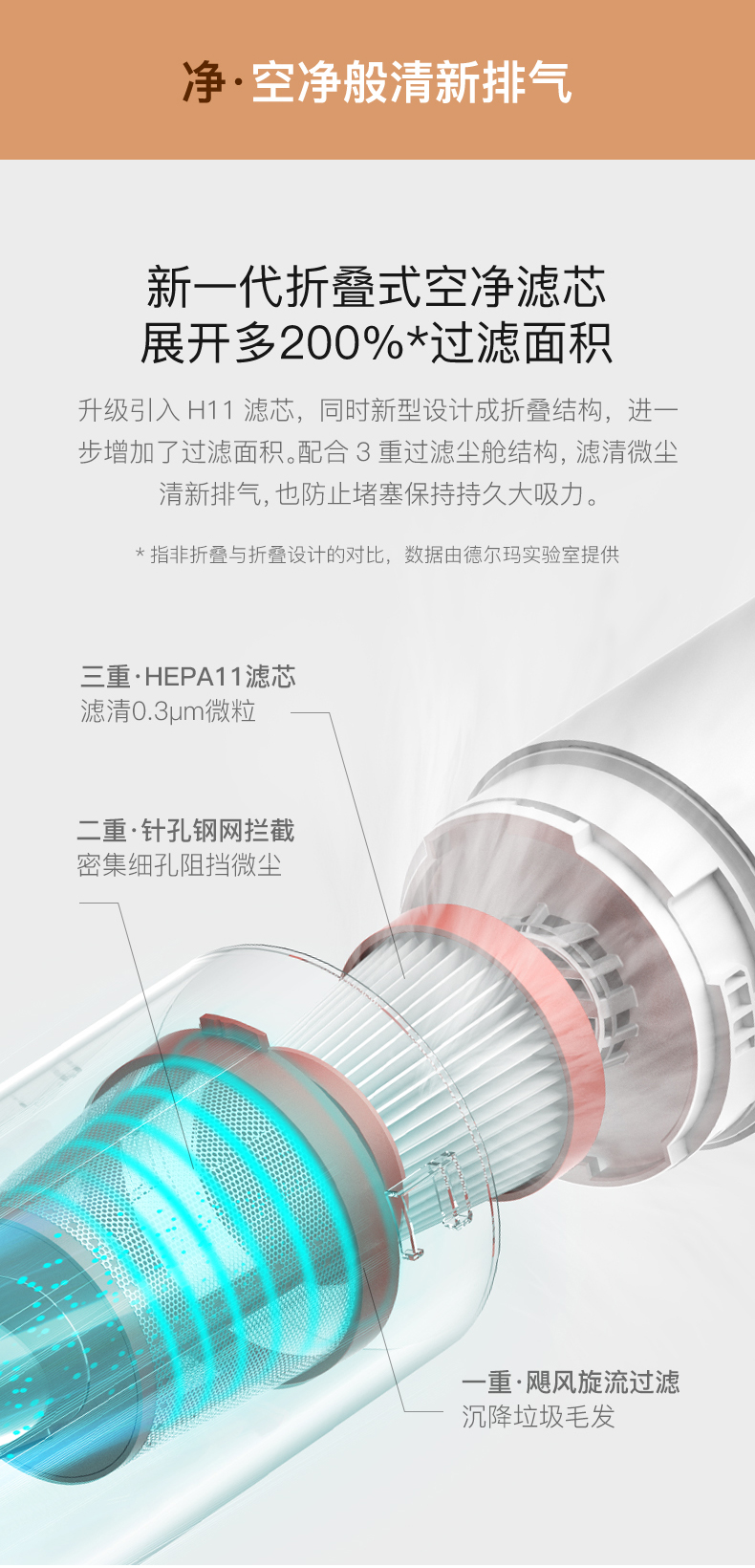 细节上:升级引入H11空净级滤芯,新型折叠结构,展开过滤面积约提升了200%,配合3重过滤尘舱结构,滤清微尘清新排气,也防止堵塞保持持久大吸力。