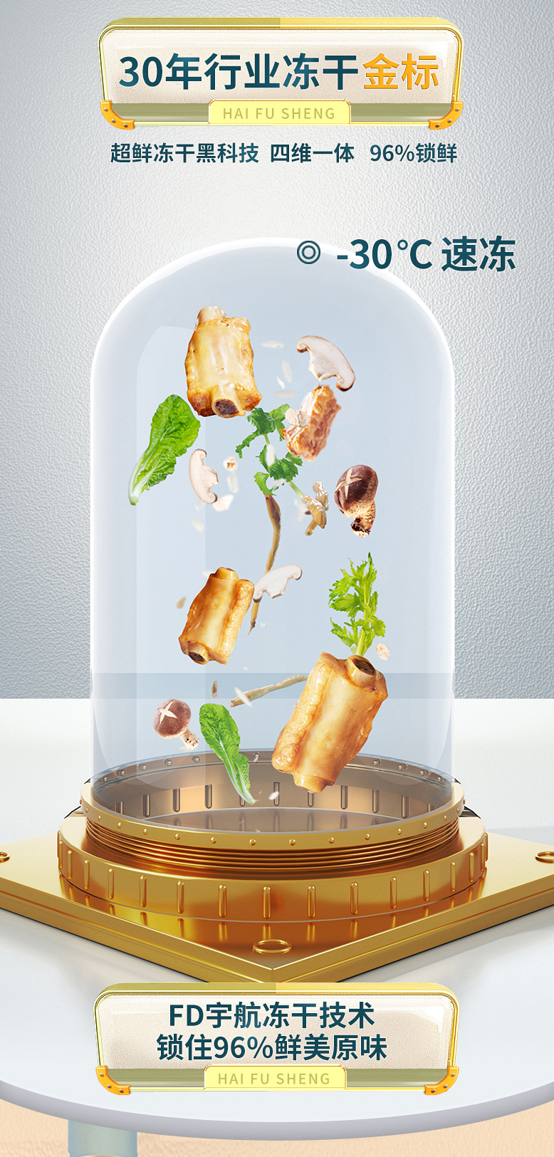 FD即真空冷冻干燥技术,最早广泛应用于医药、生物、航天、航空事业等。采用快速冻结,真空冰状脱水,很好的保留了食材的色香味及营养成和食物外观,具有良好的复水性。即使不添加任何防腐剂,就可以保存很长时间。