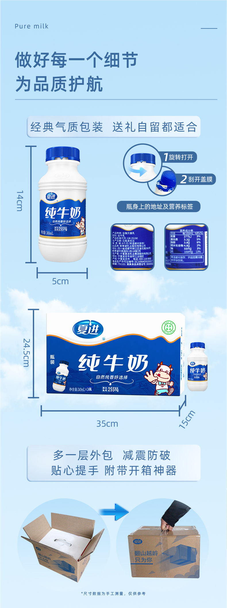 这款夏进 全脂纯牛奶,每100ml牛奶中含能量 260KJ(3%)、蛋白质 3g(5%)、脂肪 3.5g(6%)、碳水化合物 4.7g(2%)、 钠 55mg(3%)、钙 100mg(13%),牛奶营养指标丰富、口感香醇浓郁,采用欧盟标准检测,食用健康安全。