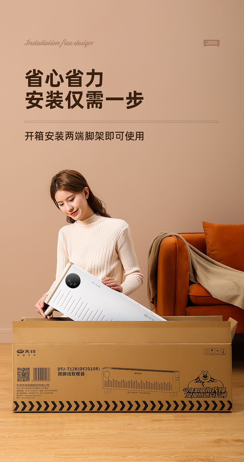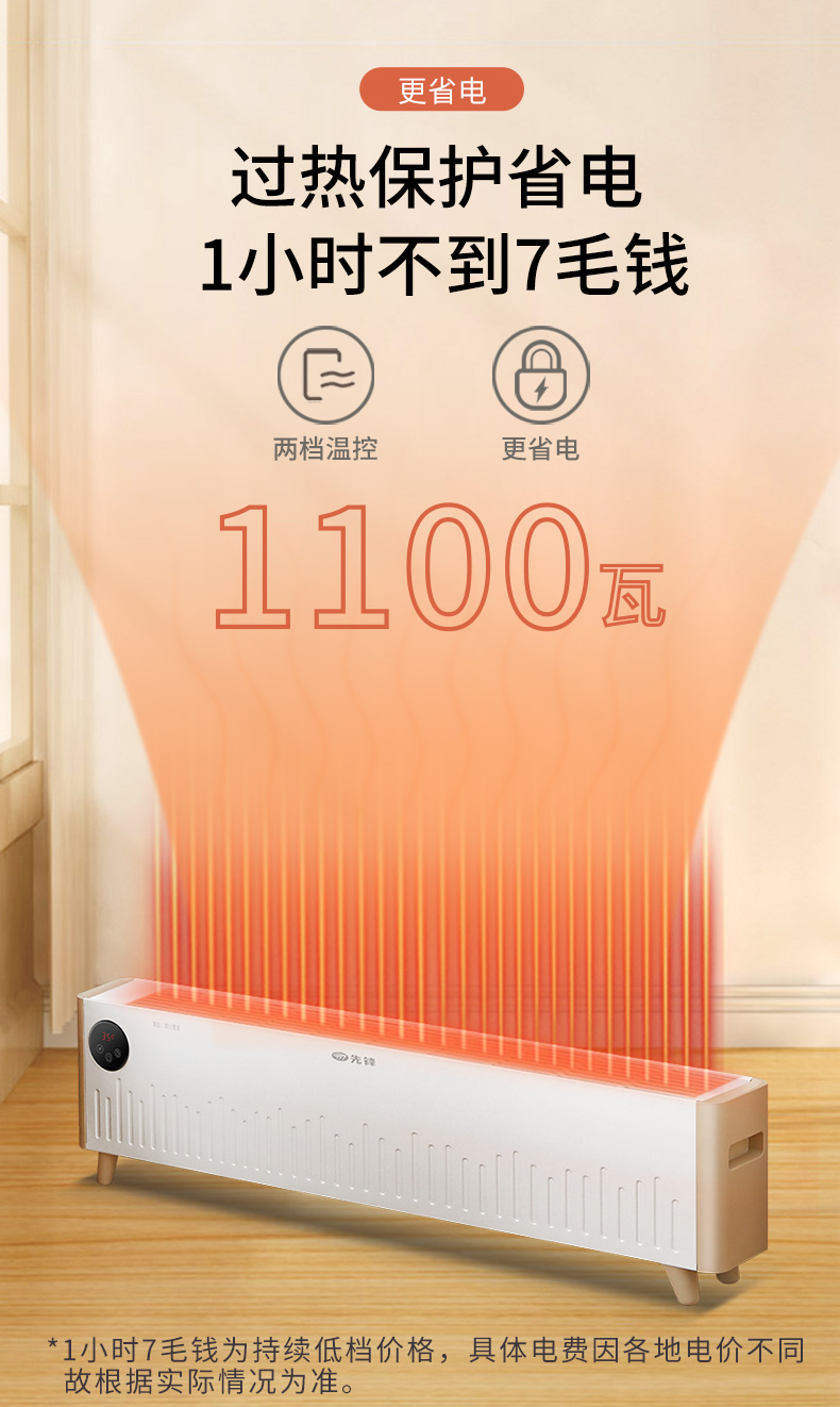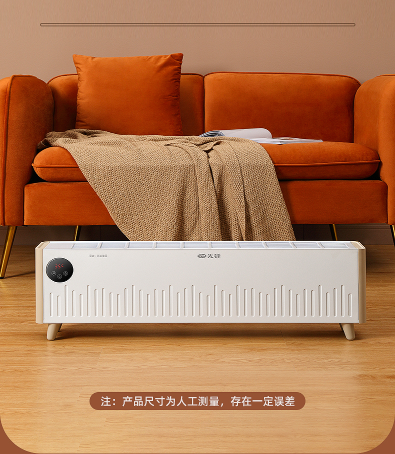 先锋北美流行踢脚线取暖器,适合20平方左右的房间,采用高品质铝合金材质,耐压耐高温,不生锈更耐用。智能控温,静音省电,循环对流,具备四重安全防护,倾倒断电,安全放心。