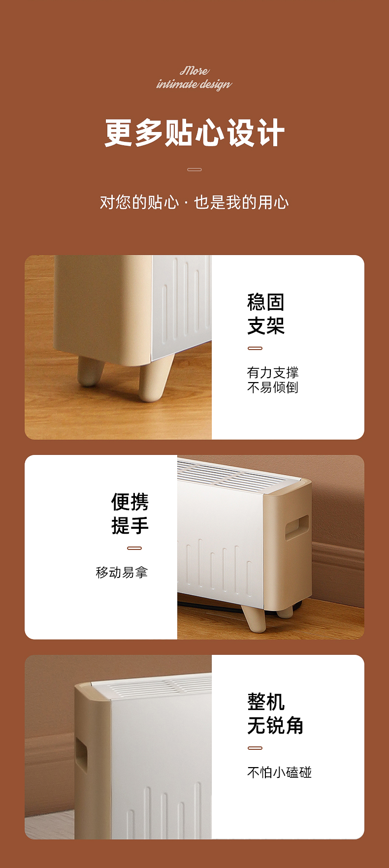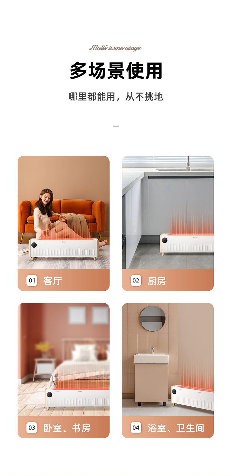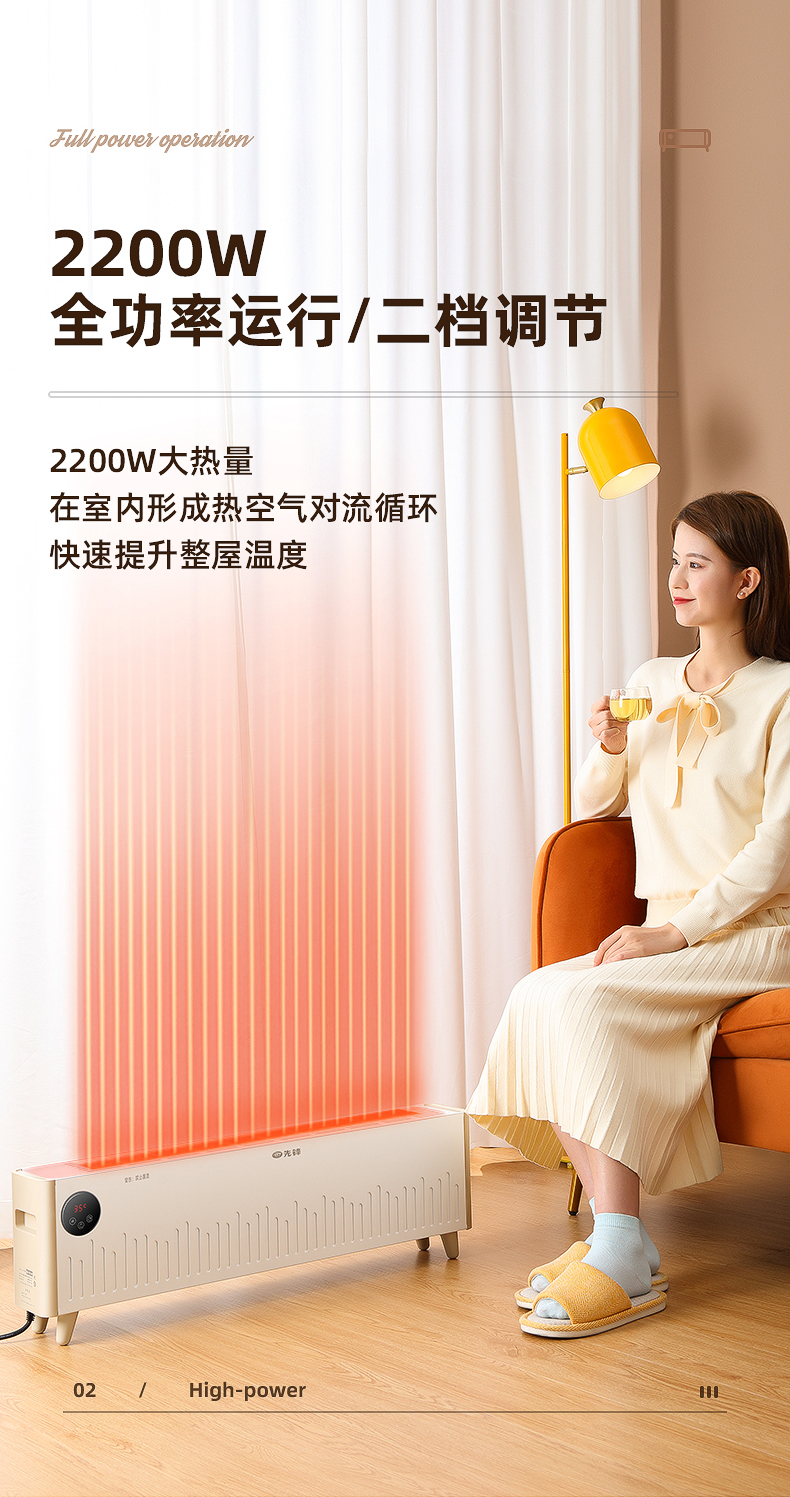 先锋北美流行踢脚线取暖器,适合20平方左右的房间,采用高品质铝合金材质,耐压耐高温,不生锈更耐用。智能控温,静音省电,循环对流,具备四重安全防护,倾倒断电,安全放心。