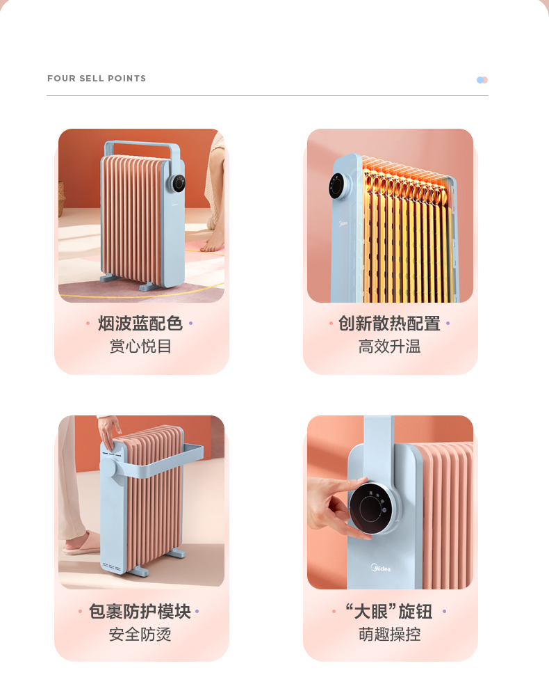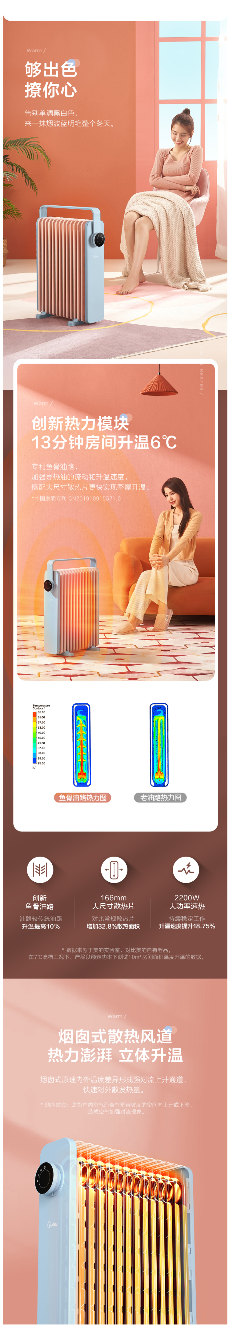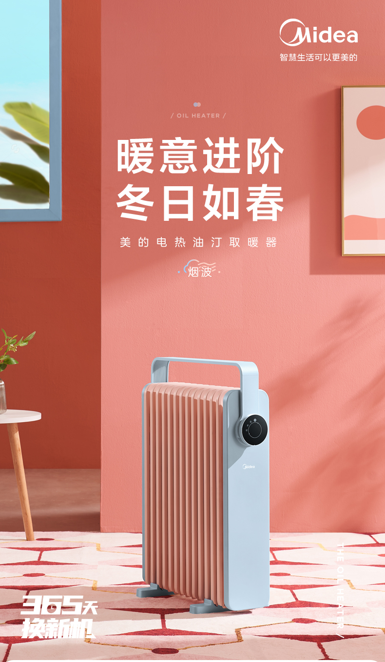 这款美的电热油汀取暖器,166mm加宽油汀片,13片油汀同时升温,创新鱼骨油路速热设计,配合烟囱散热风道,散热面积更大,提高了热效率,制热速度更快,使用寿命更长。