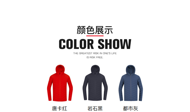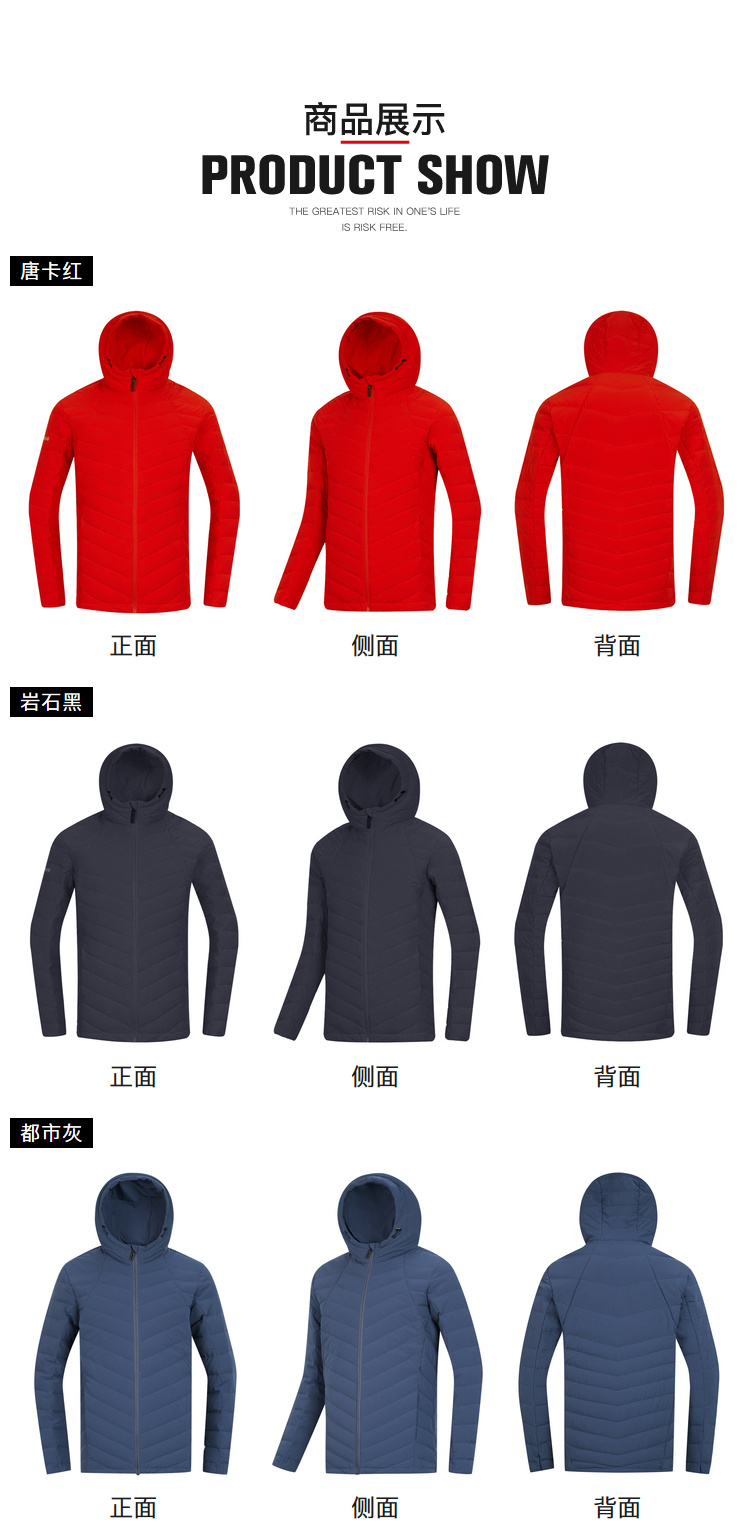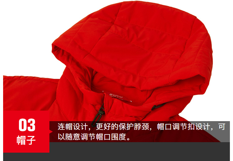 在款式上,符合人体工程学的风格线设计,更好的修饰身形和保证活动自如。一体连帽设计,搭配半高领,能保暖防风,帽子两侧还有可调节弹力松紧。