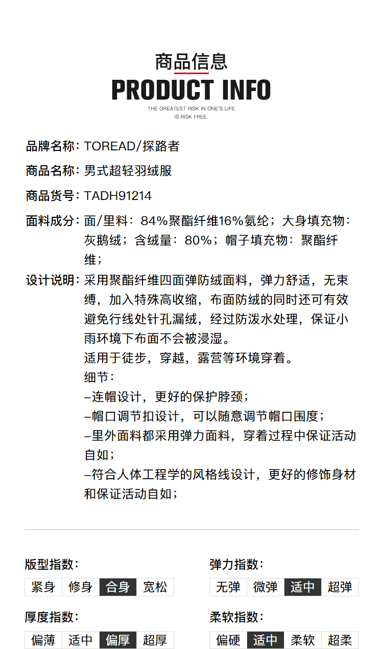 这款探路者男超轻连帽羽绒服,外层是84%聚酯+16%氨纶混纺的四面弹防绒面料,弹力舒适无束缚,还加入了防泼水技术,防风防泼水还耐磨。