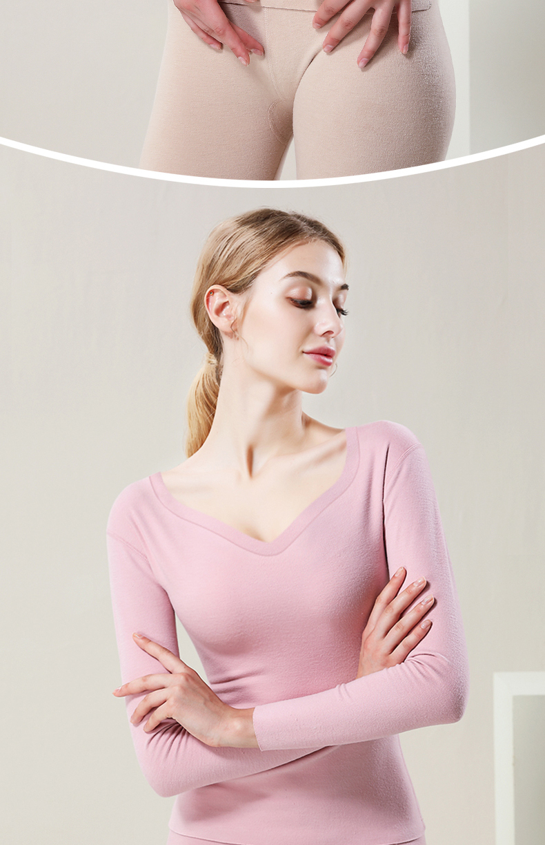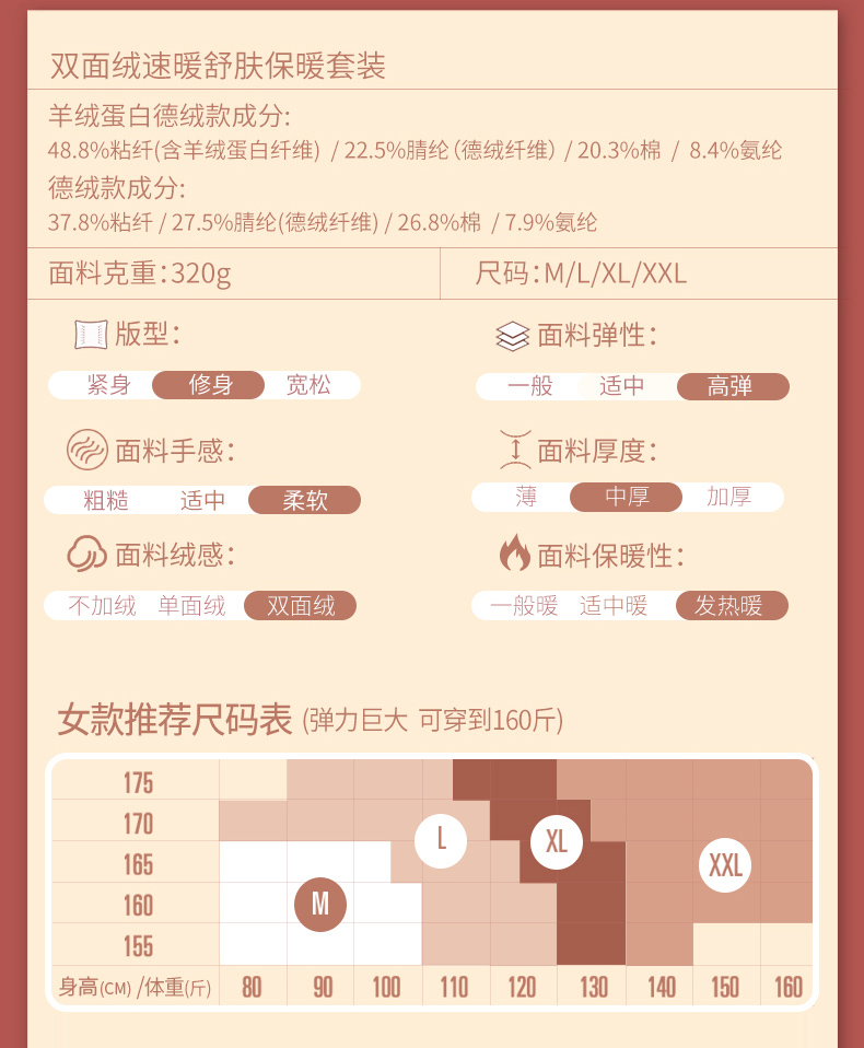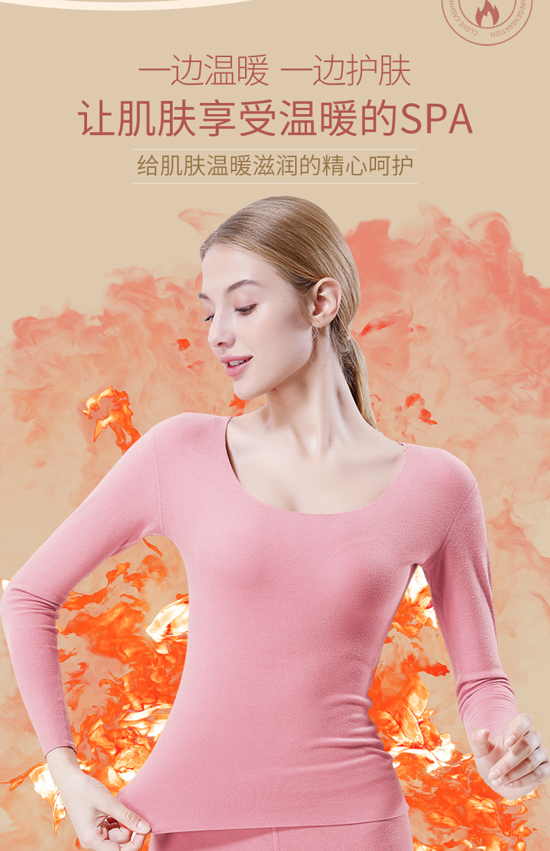 这款保暖内衣,面料材质成分: 粘胶纤维(粘纤)48.8% 聚丙烯腈纤维(腈纶)22.5% 棉20.3% 聚氨酯弹性纤维(氨纶)8.4%四种纤维混纺,面料有着比棉更柔软的触感,且吸湿性好,穿着透气舒适,不易起皱,双面磨绒处理贴身穿着保暖更舒适;