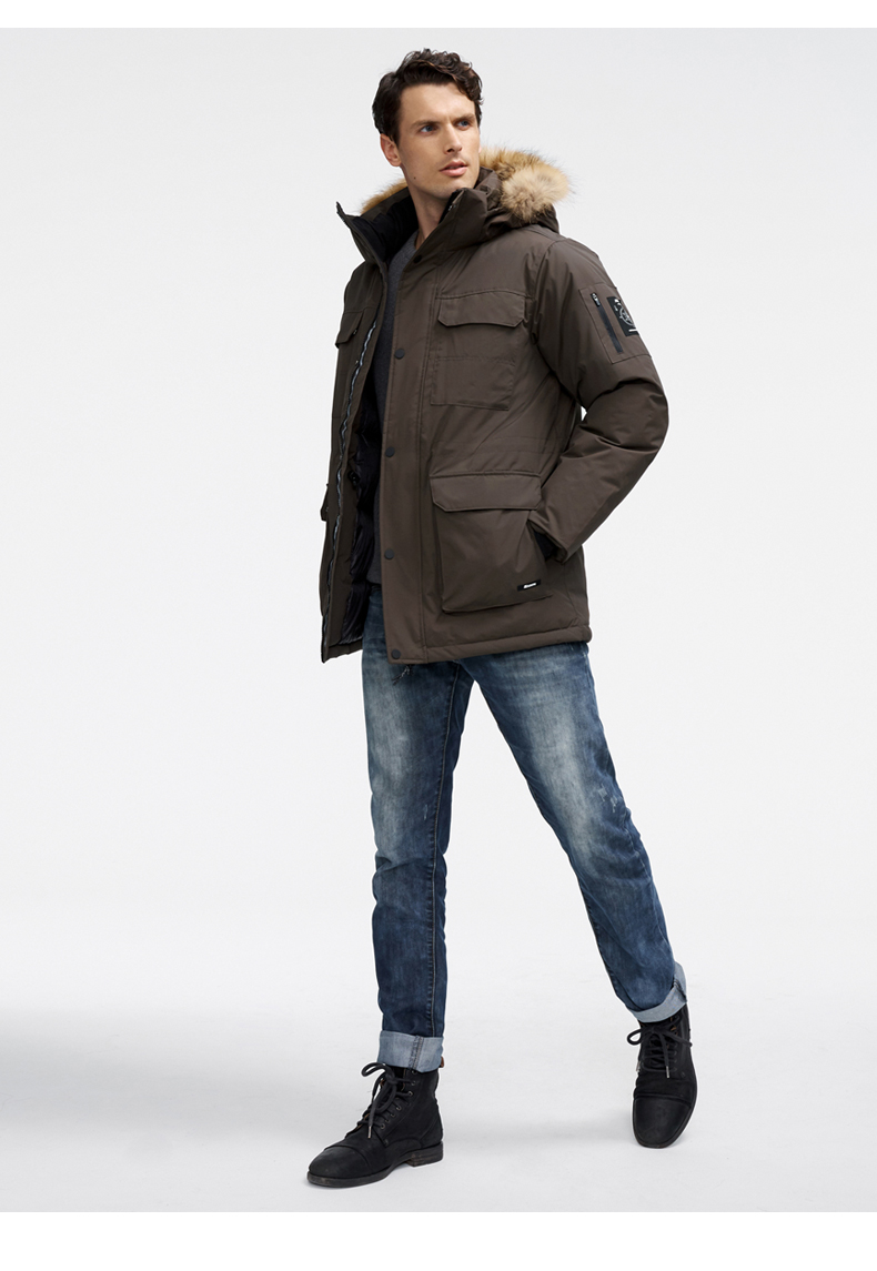 这款君羽寒峰男中长款羽绒服,属于极寒系列,可抗-30℃~-40℃,是2018年的冬季款,内里填充了800蓬90%鹅绒,L码充绒300克,属于超重装羽绒服。外层是高密度耐磨锦纶布,伴有压胶加持,可防风防雨雪。工装风款式,长度过臀及大腿。