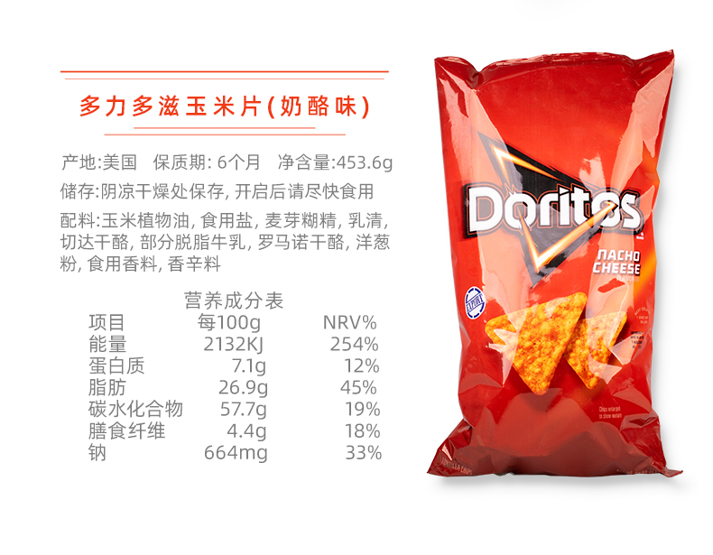 这款多力多滋玉米片是一款膨化薯片,使用本土优质玉米为原料,三角形状,香脆大片,入口咔吱咔吱脆。