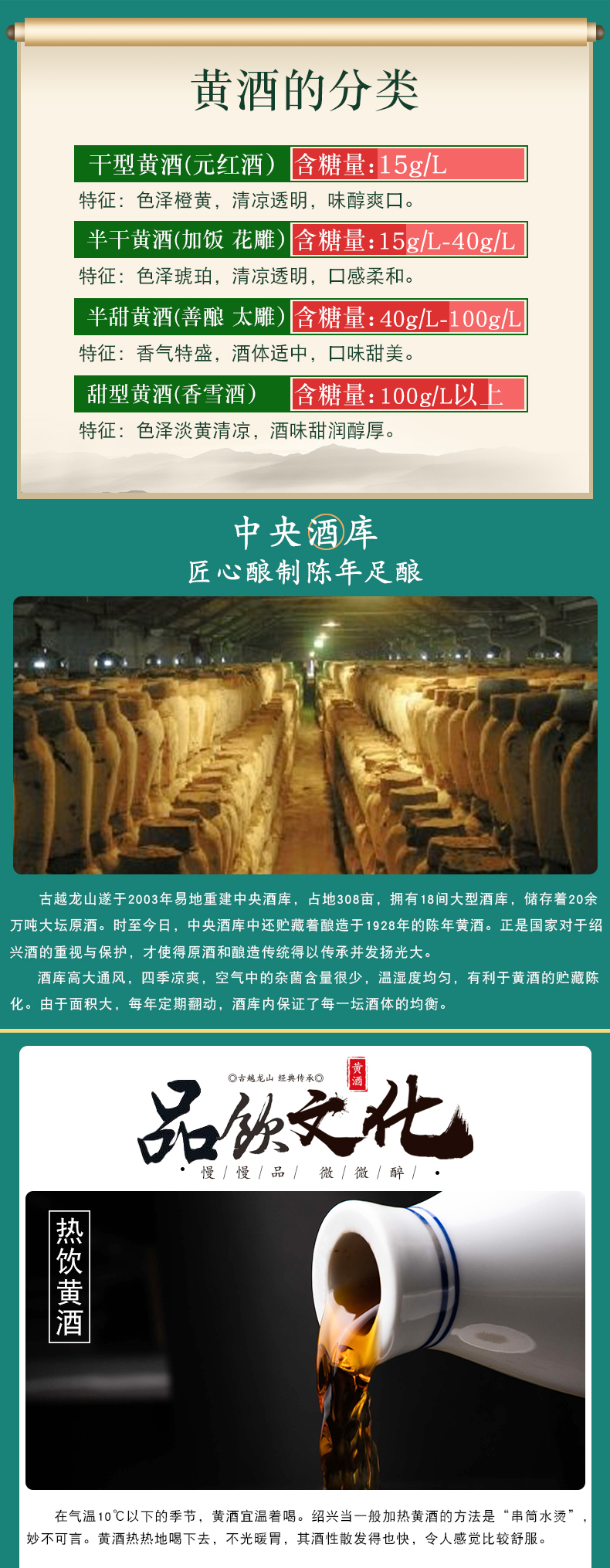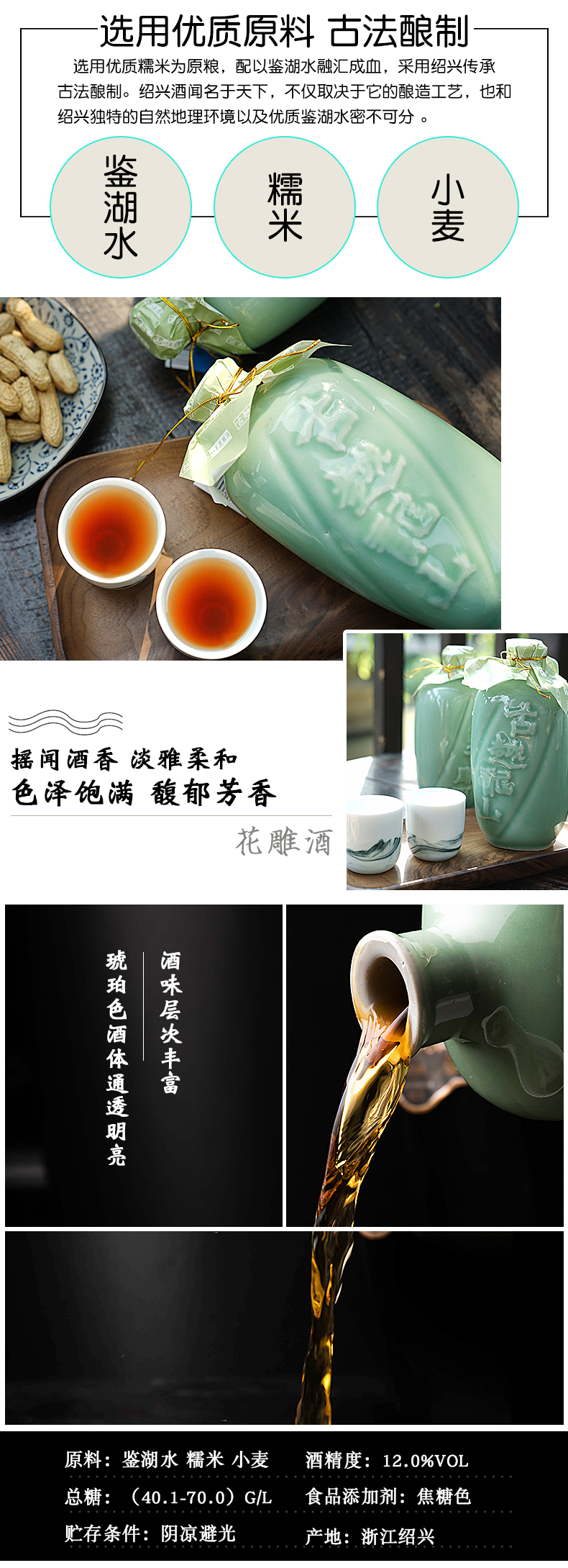 这款古越龙山绍兴黄酒,以糯米、小麦、鉴湖水为原料,使用传统的酿制技艺,农历七月制酒药,八、九月制麦曲,小雪做酒酿,大雪前后投料开酿,用独特的复式发酵工艺发酵90余天,翌年立春开始压榨、煎酒,然后泥封贮藏。