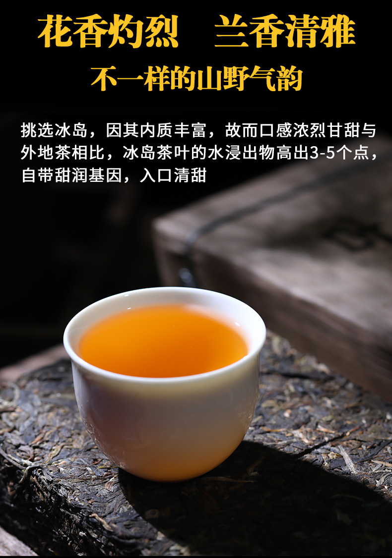 茶汤金黄通透,因其内质丰富,故而口感浓烈甘甜与外地茶相比,冰岛茶叶的水浸出物高出3-5个点,自带甜润基因,蜜甜在口腔中弥漫,鼻息呼出亦有,让人总是忍不住多喝几口,久久不想放下手中茶杯。