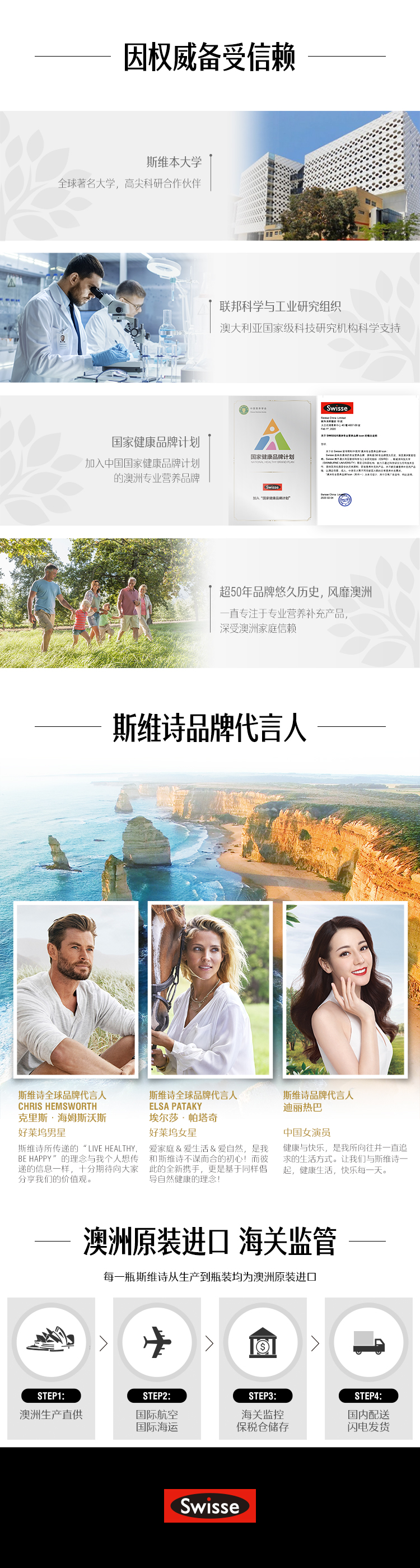 Swiss是近两年风头很盛的自然健康品牌,于1960年在澳大利亚墨尔本创建,号称澳洲顶级保健品,同时也是澳洲自然医学疗法的先驱之一,公司主旨是倡导缔造健康和高品质生活,有超过25年的科学研究和临床试验的基础,其原料采购和生产工艺均通过全球最高处方药的生产标准TGA。