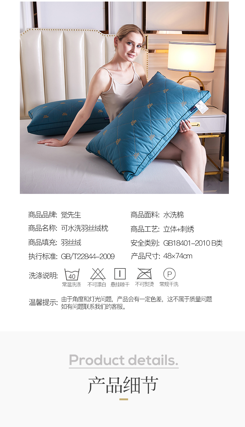 这款觉先生 羽丝绒绣花酒店枕头 一对装,优选舒适亲肤水洗棉面料,吸湿透气不闷热;羽丝绒填充,立体绗缝工艺,支撑着颈部,有效缓解疲劳;精美绣花工艺,美观时尚;采用可水洗工艺,耐水洗,洗涤不变形。