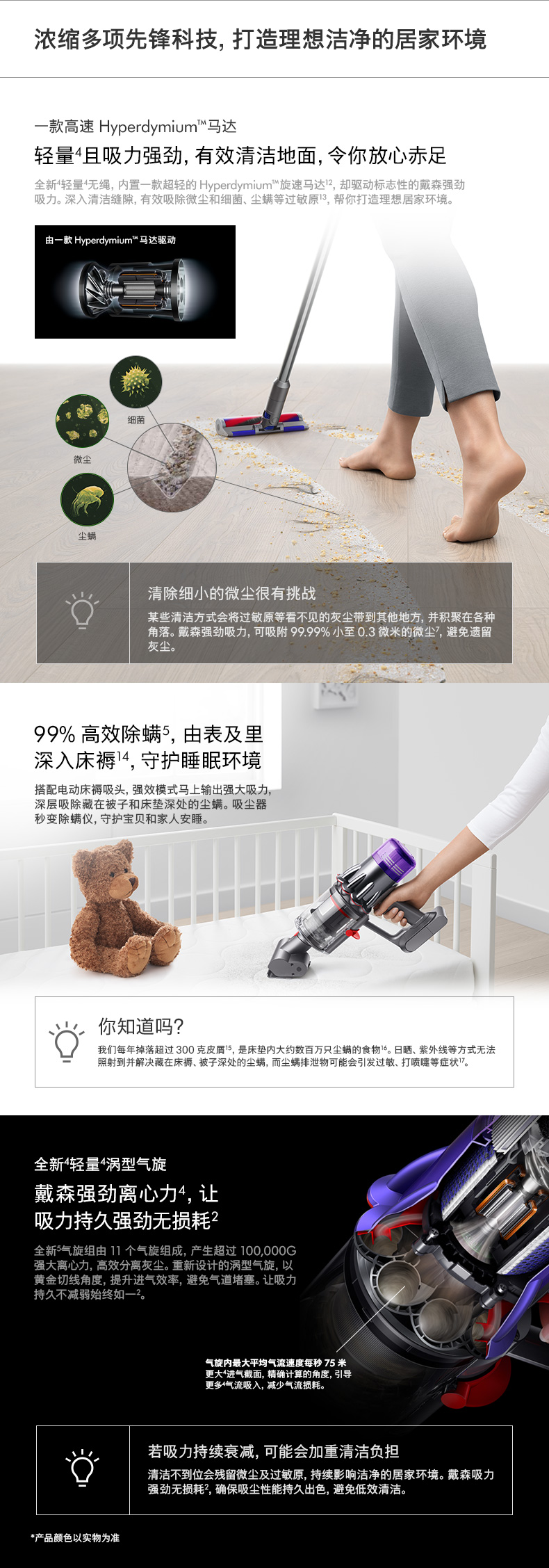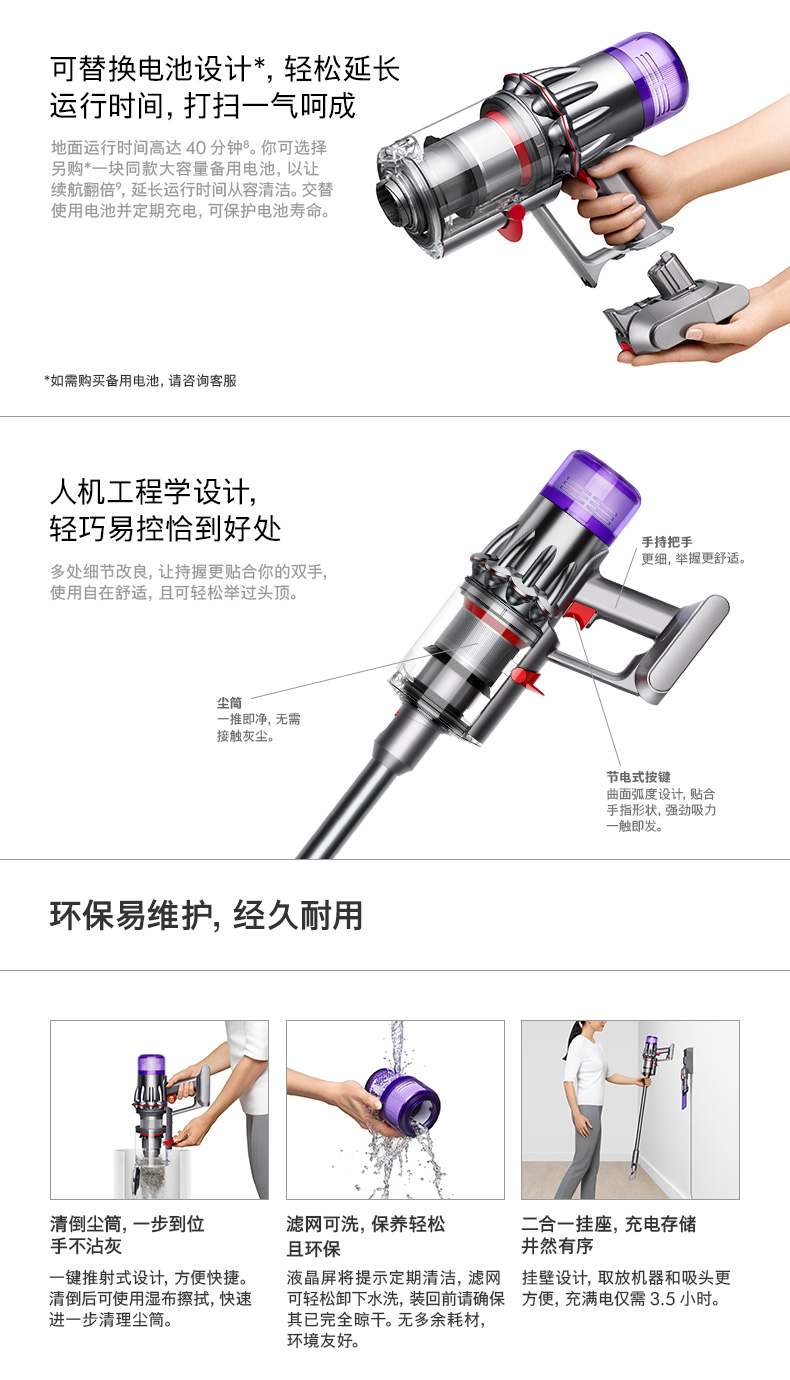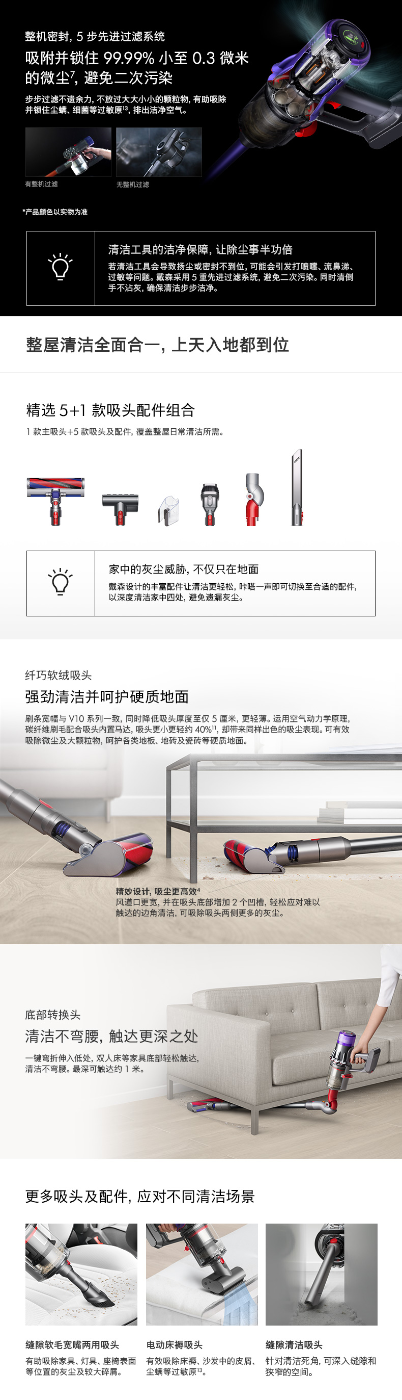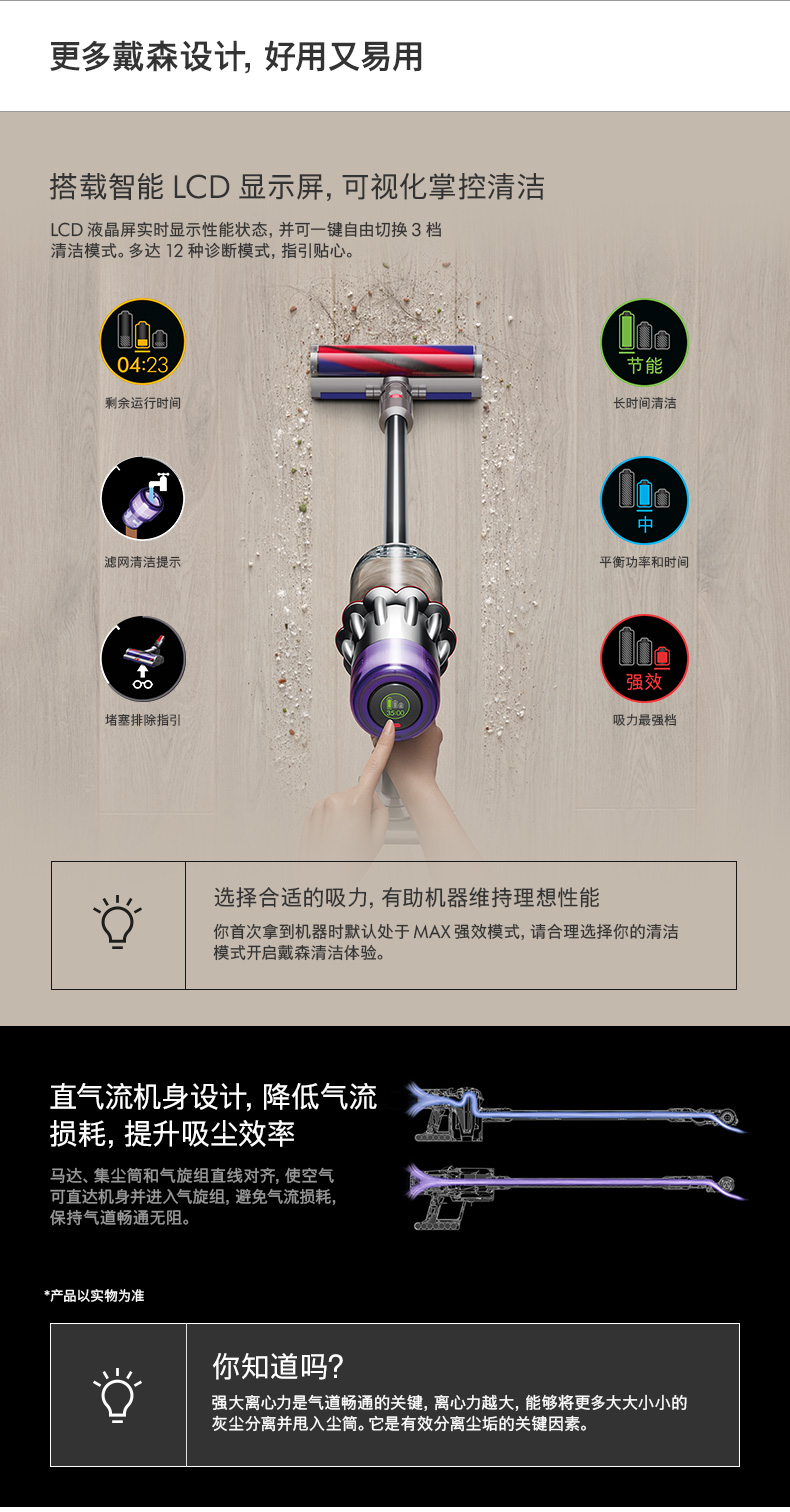 直气流机身设计,吸力持久强劲无损耗,11气旋高效分离灰尘,5步先进过滤系统,吸附99.99%微尘。