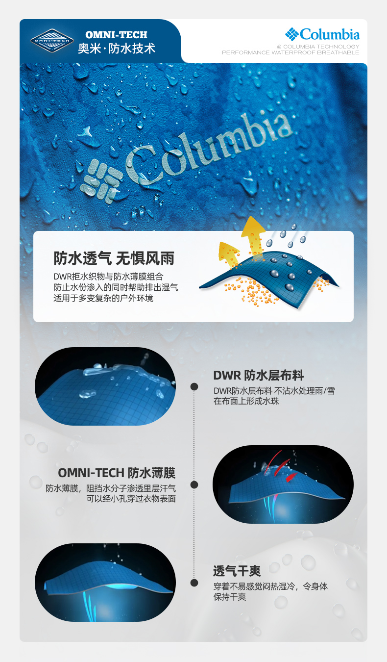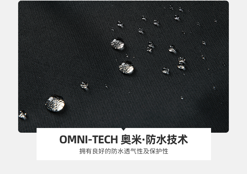 DWR防水层布料,会在面料表层形成水珠滚落。OMNI-TECH防水薄膜,能阻挡水分子渗透里层,汗气可以经小孔穿过衣物表面。