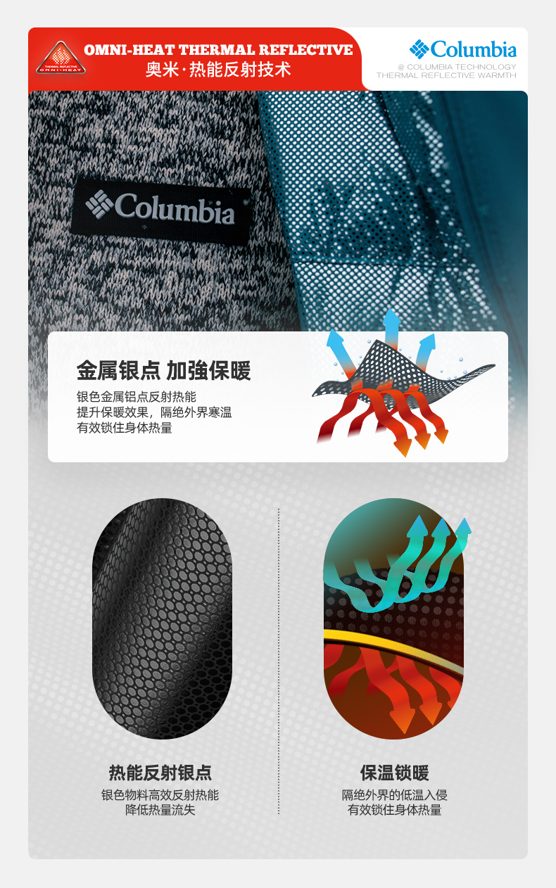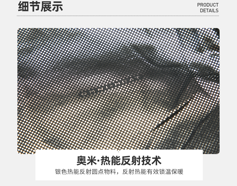 运用奥米热能反射技术,银色金属铝点发射功能,提升保暖效果,隔绝外界寒温,有效锁定身体热量。