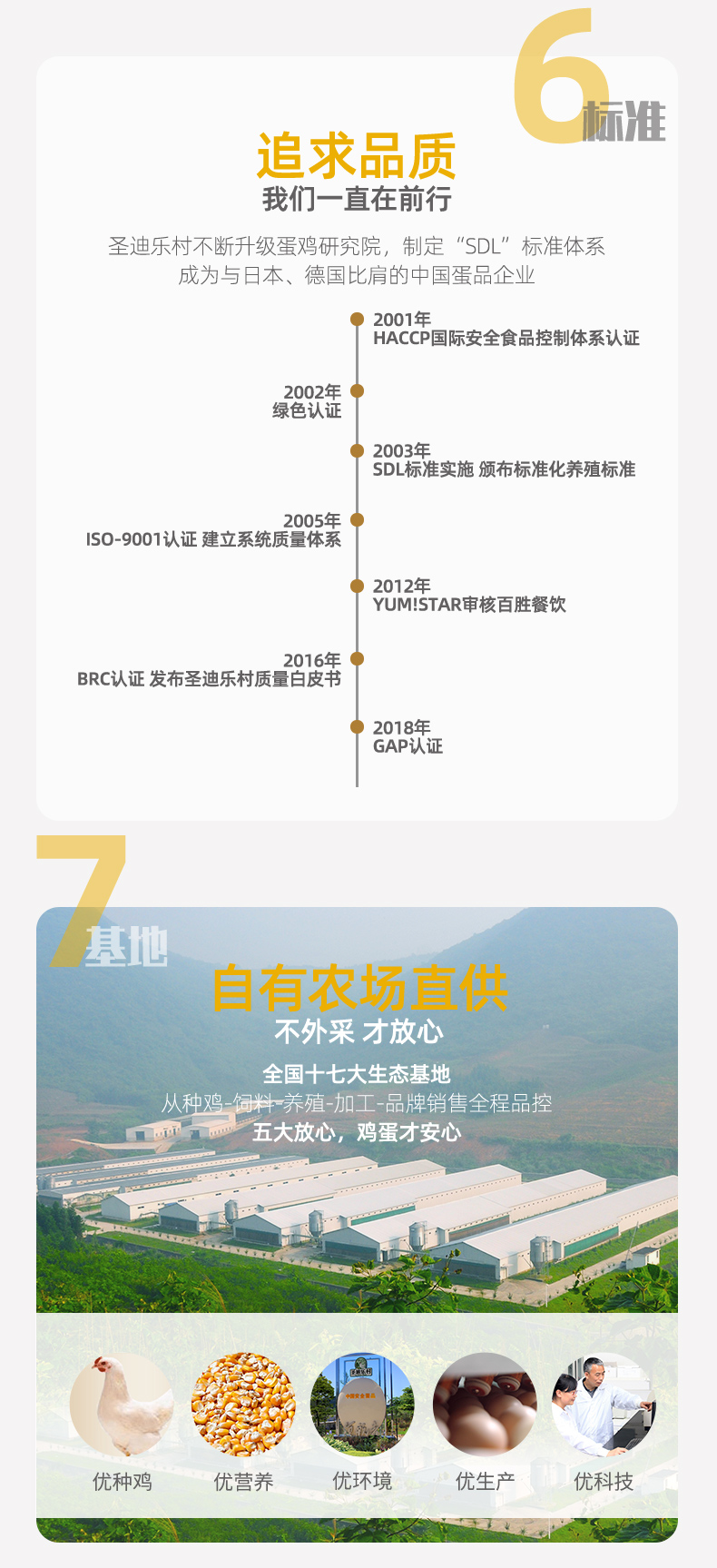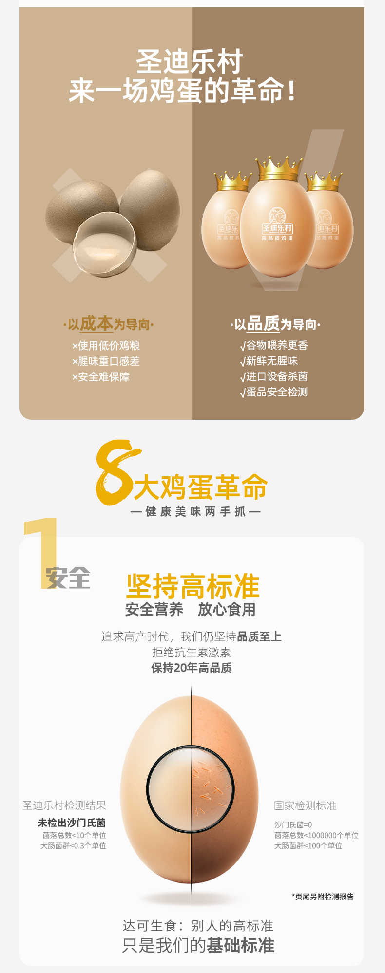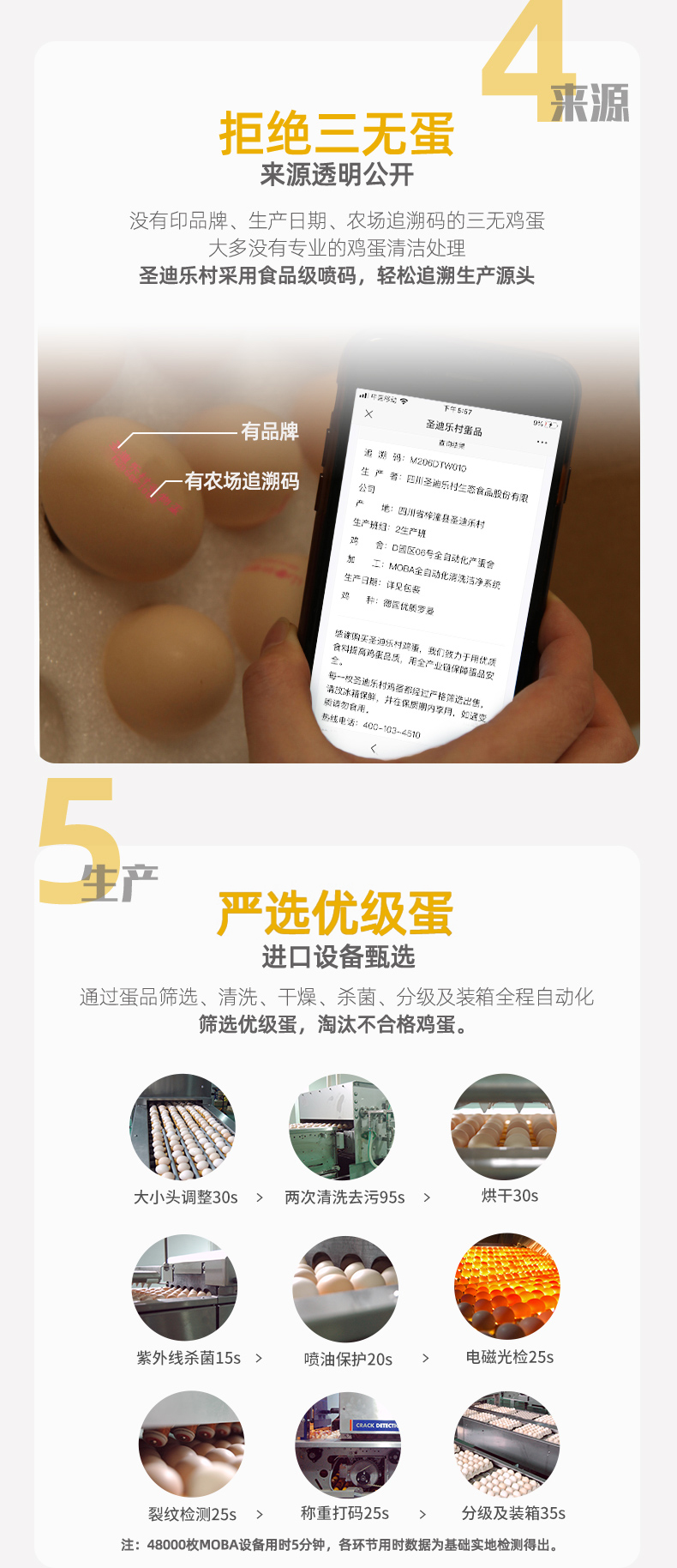 圣迪乐村是国宴峰会指定的蛋品供应商,采用德国罗曼种鸡,谷物喂养,每一个蛋品都可溯源,拒绝使用抗生素激素,同时引进MOBA设备,通过紫外线杀菌,至今未检出沙门氏菌,是放心安全的鲜鸡蛋,达到A级标准。