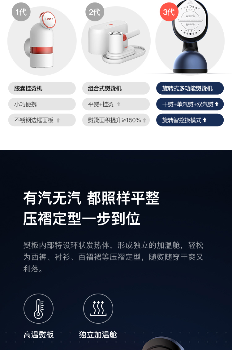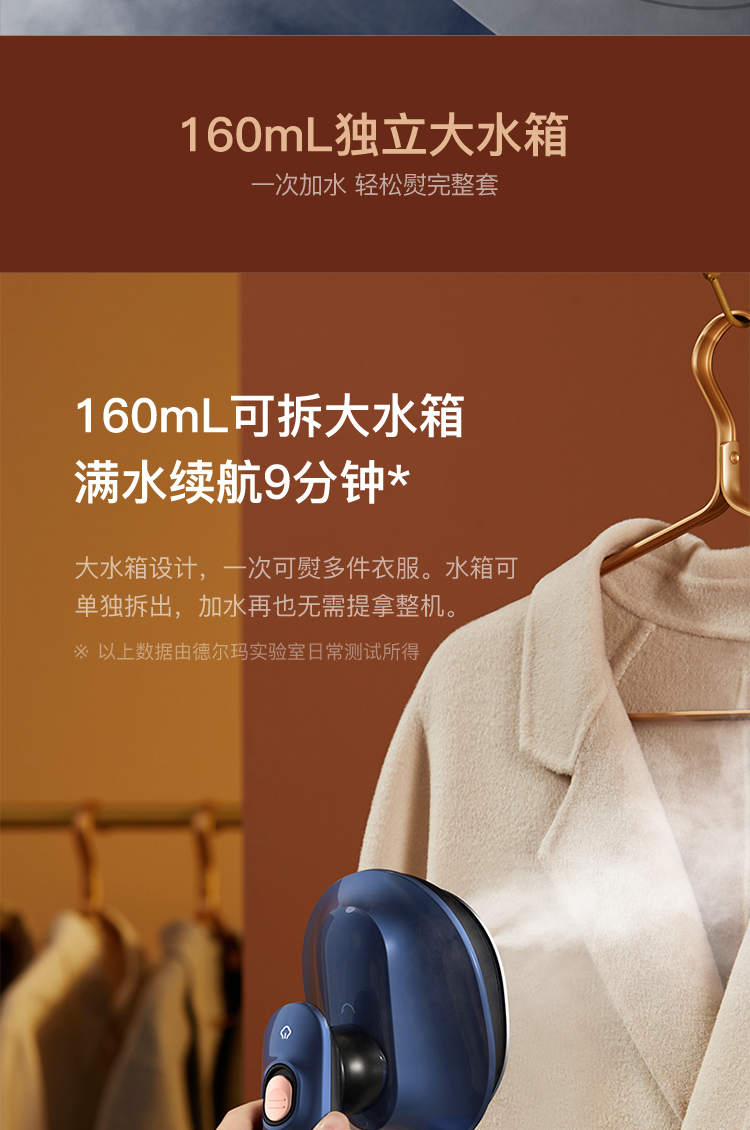 升级无边熨烫大面板,采用3mm厚纳米陶瓷釉铝合金材质,顺滑熨烫不伤衣,面板新式可旋转结构,实现180°旋转,随心切换电熨斗、挂烫机模式;巧设美人尖,即使衣领、纽扣、边角等细小褶皱也可轻松熨平。160ml可拆卸大水箱,满水续航约9分钟,一次可满足多件衣服使用需求。