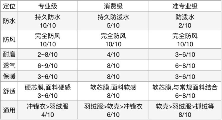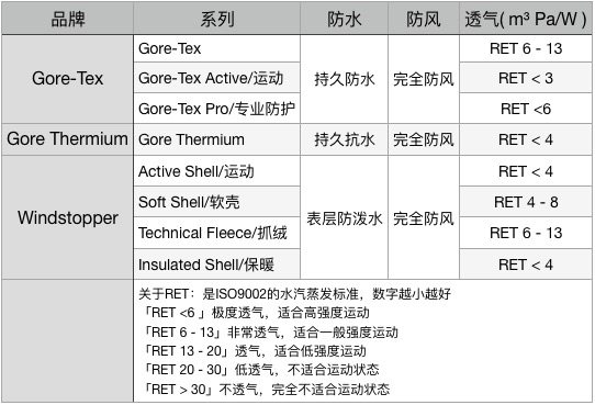 注:以上为总体情况,不考虑独特面料如意,不考虑Shakedry这种特殊Gore-Tex面料