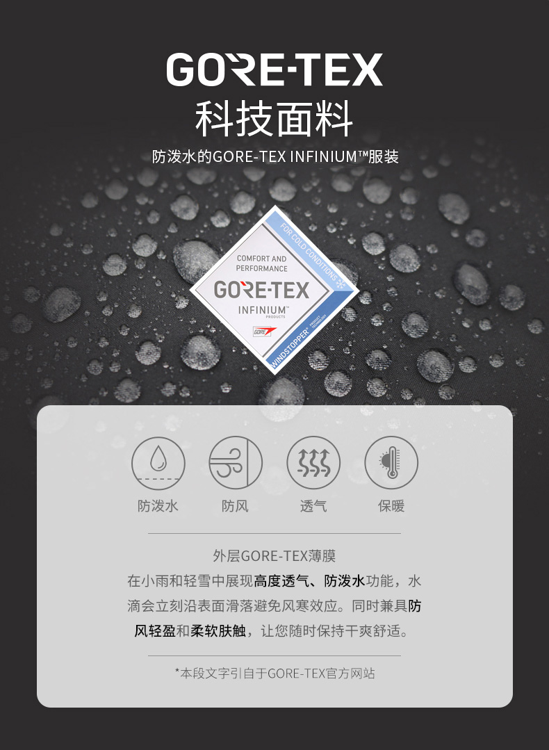 Gore Thermium的核心特点就是保暖好,官网说法是Gore-Tex的7倍。Gore Thermium使用软芯膜,不是之前的硬芯膜,面料触感更舒适。Gore Thermium的防水级别为「持久防泼水」,可防中雨的级别。