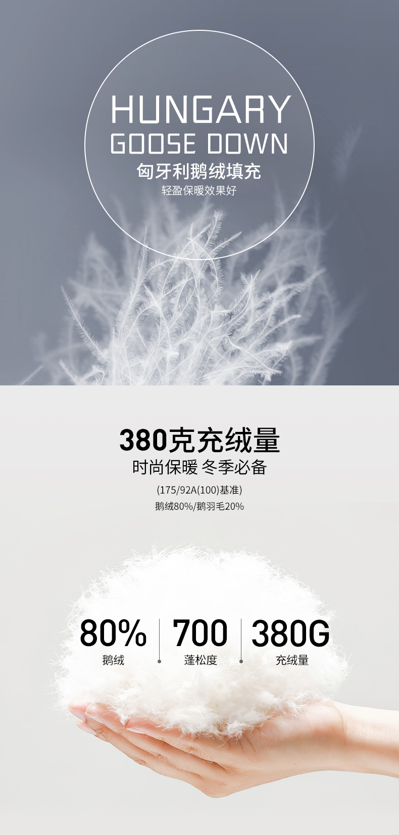 内里填充的是匈牙利大鹅腹部优质大绒朵鹅绒,含绒量80%,高达380g充绒量(175/92A)属于厚款羽绒服,保暖非常好,不是太冷的情况下简单内衣就可达到保暖需求。