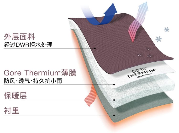 Gore Thermium的防水性能略低于Gore-Tex,但也高于大多数冲锋衣和Windstopper,可防小雨和冰雪,排湿透气性能要高出很多,适合没有大量液态水的冰雪环境。适当降低了防水要求,全面提高了舒适性,透气性,和搭配羽绒服棉服设计的功能性。