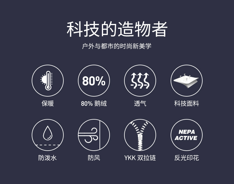 整体设计简洁时尚,没有多余点缀,门襟与口袋拉链全部使用封口防水拉链,有优秀的防泼水功能,防风袖口,可调节按扣设计,提高防风保暖性能。