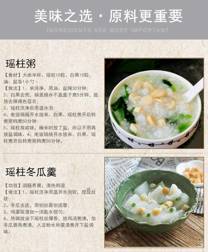 干贝营养价值非常的高,具有滋阴补肾、和胃调中功能,能治疗头晕目眩、咽干口渴、虚痨咳血、脾胃虚弱等症,常食有助于降血压、降胆固醇、补益健身。在古时是进贡皇室的珍品。领券链接点此
