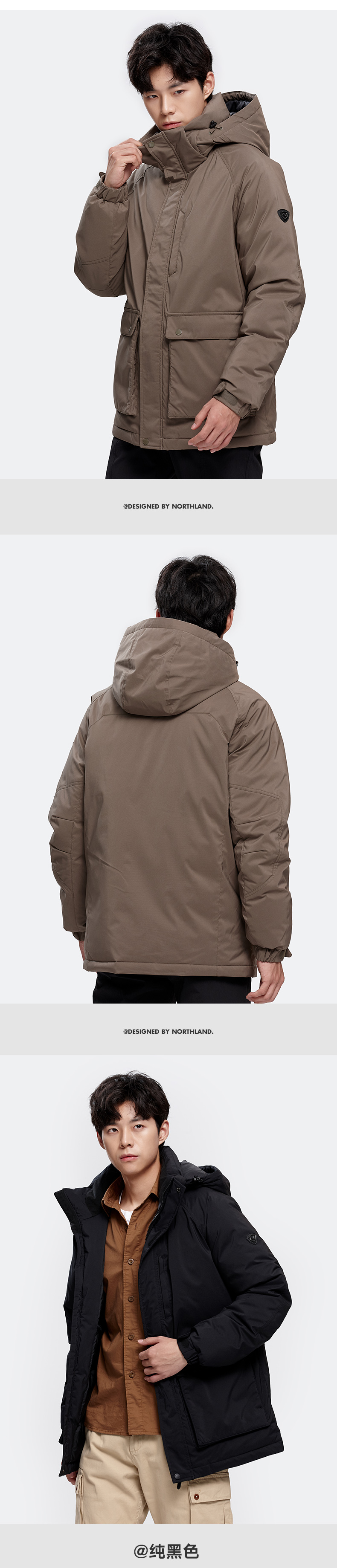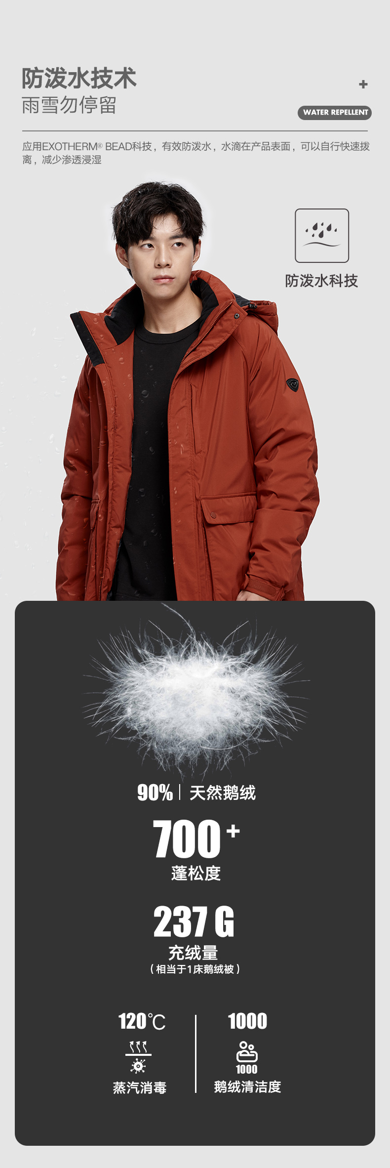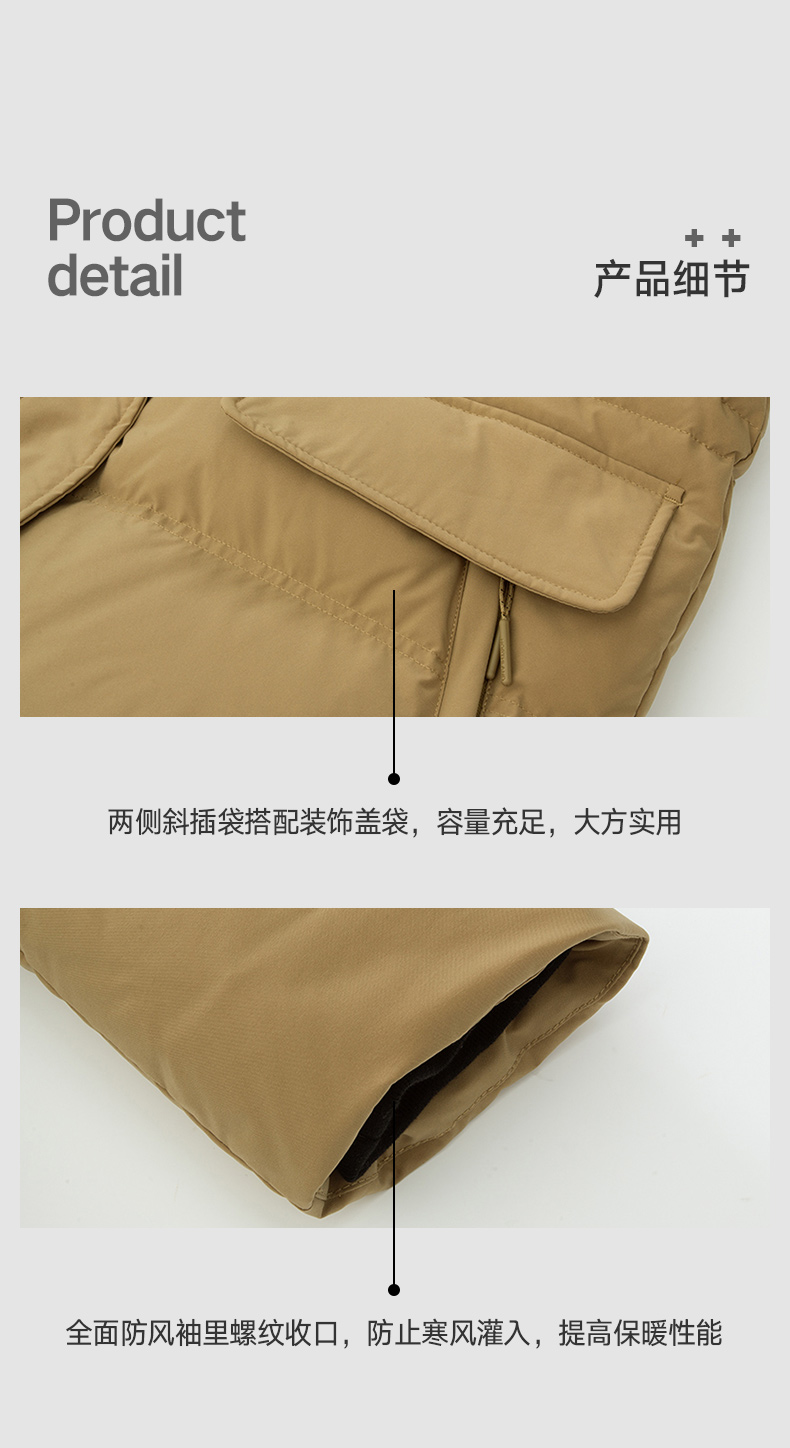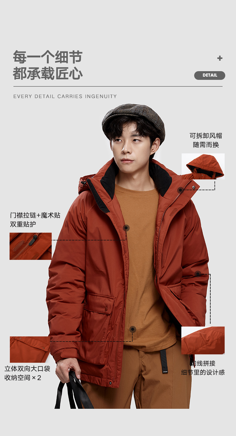 面料拥有防风防泼水功能,4层锁绒工艺:面布、双层胆布、高密里布和德国防绒针,有效防止钻绒,接近0跑绒。细节方面,全身全部采用日本高品质YKK拉链,提拉顺畅;高领连帽设计,防止冷风灌入,细节精致到位。简约纯色款式,百搭穿着。