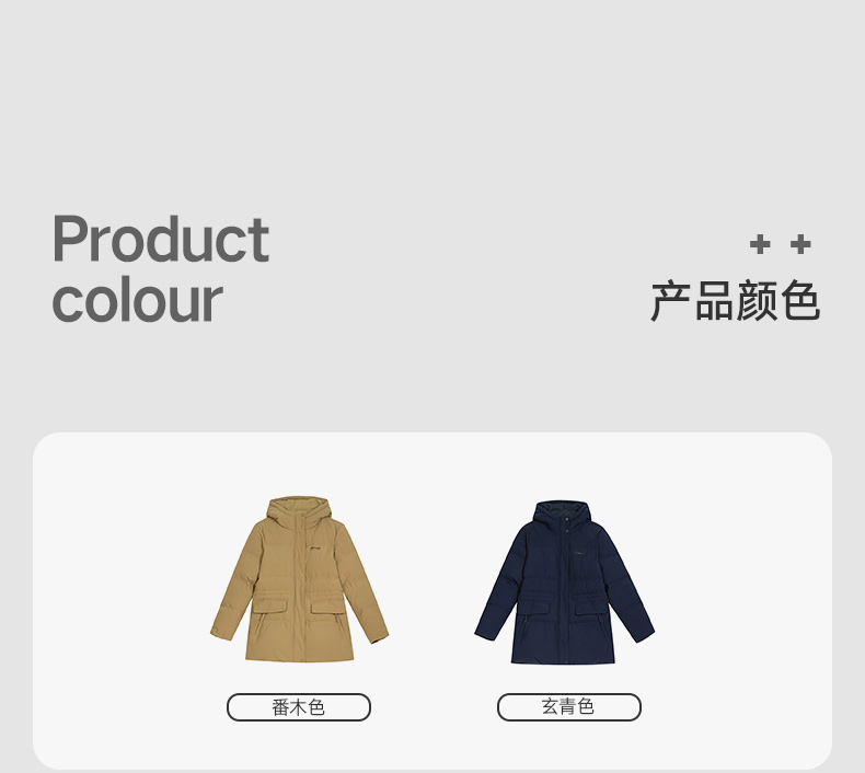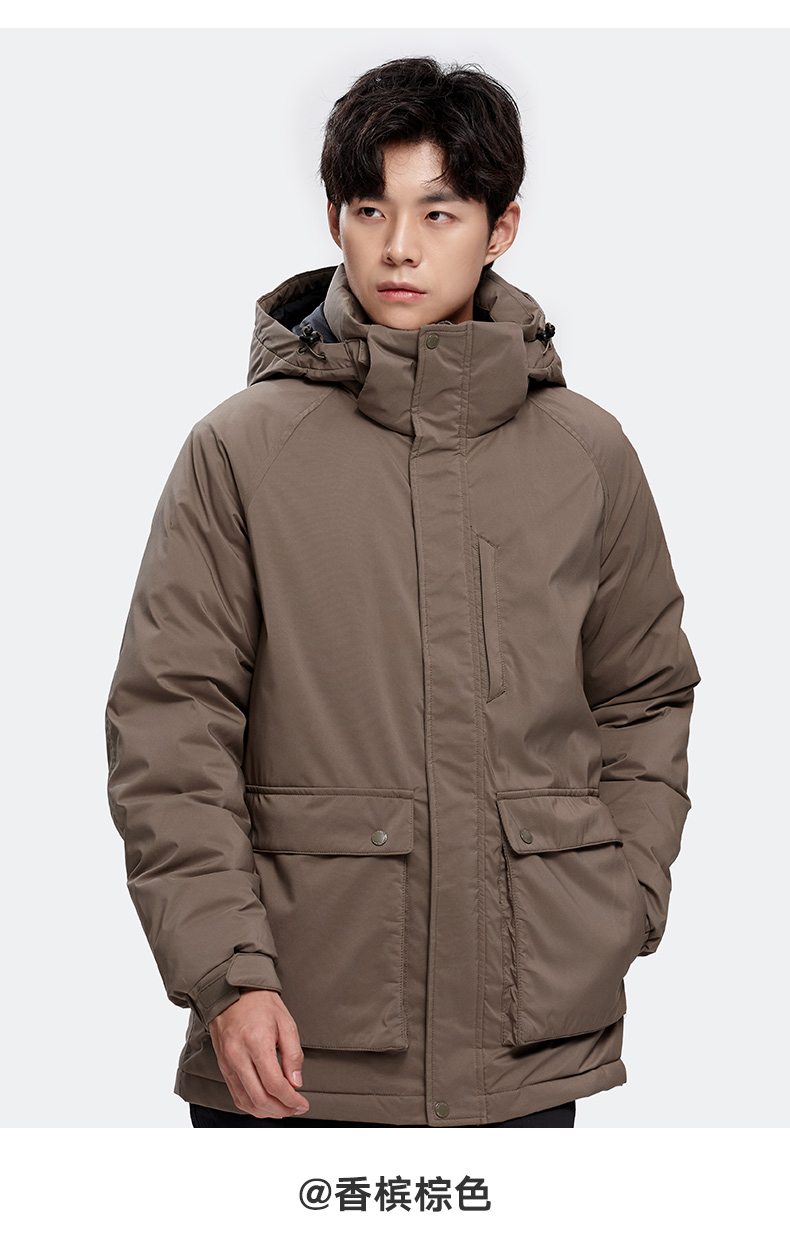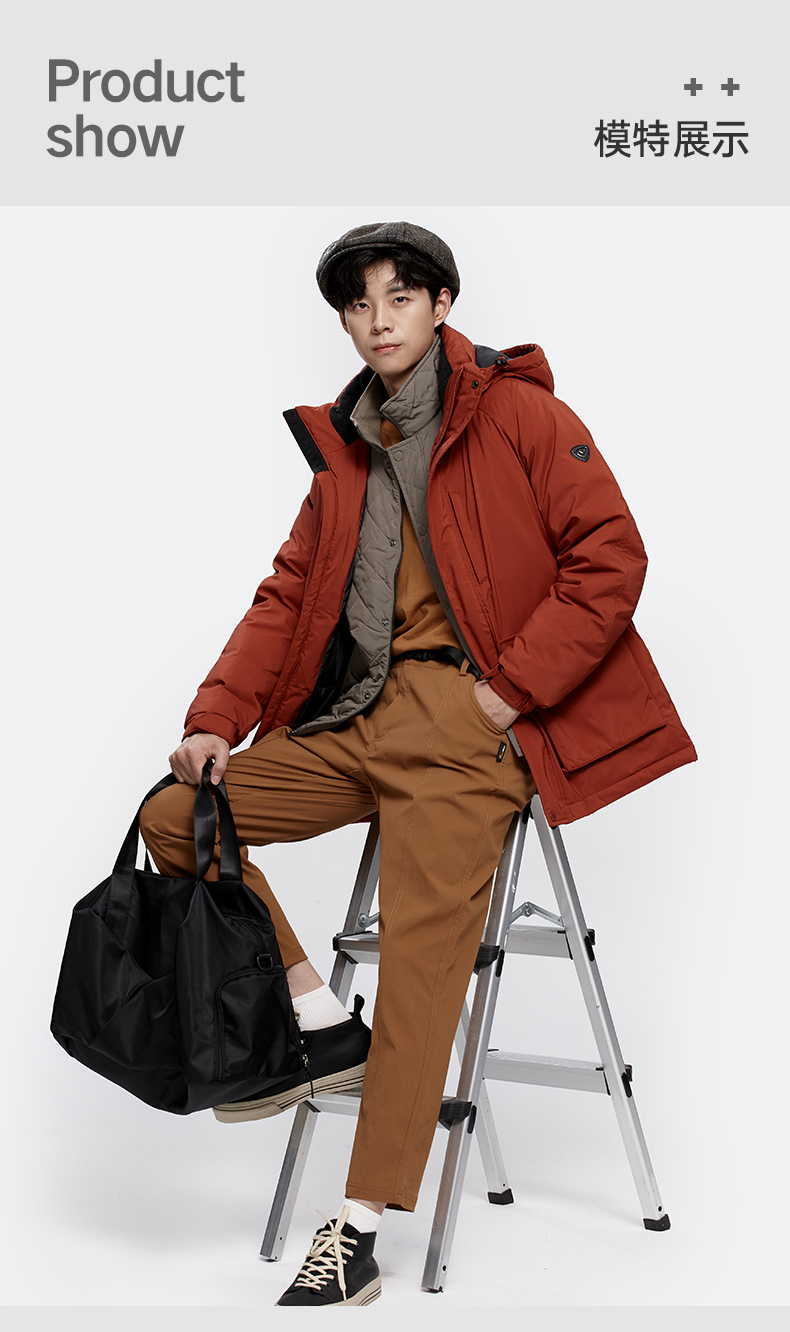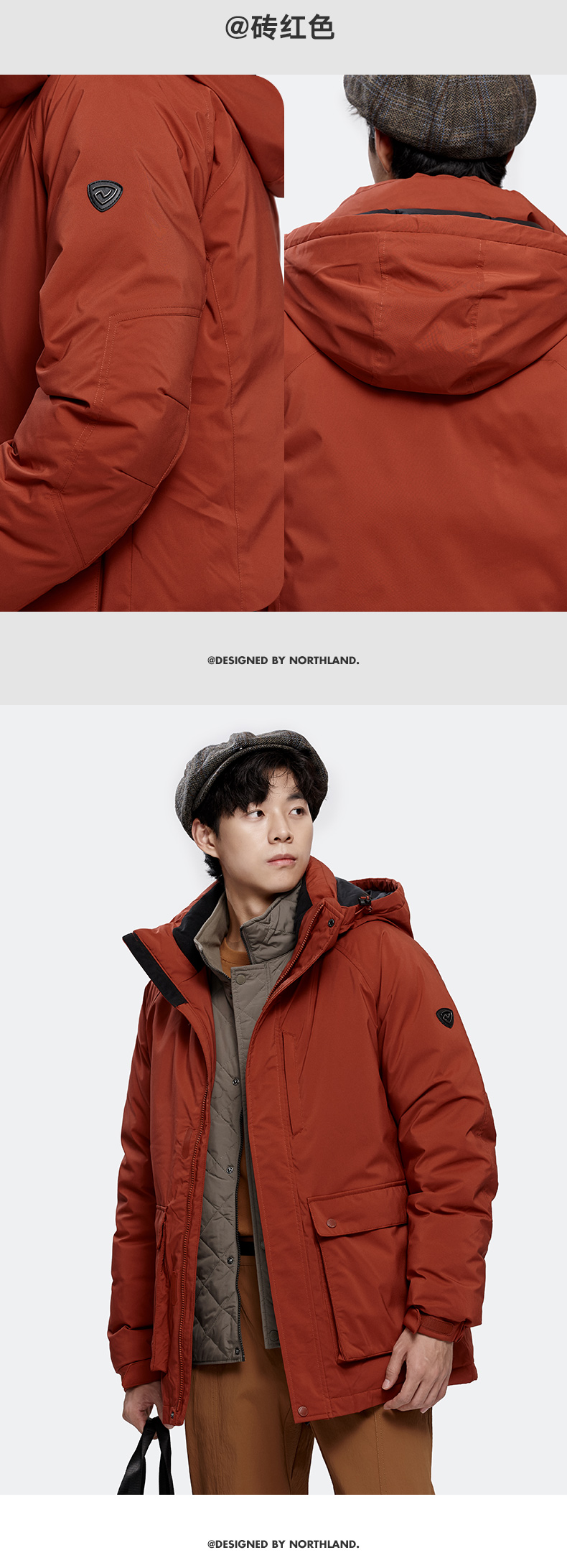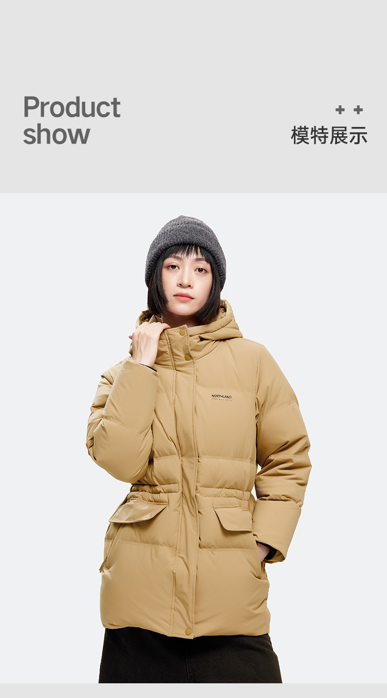 面料拥有防风防泼水功能,4层锁绒工艺:面布、双层胆布、高密里布和德国防绒针,有效防止钻绒,接近0跑绒。细节方面,全身全部采用日本高品质YKK拉链,提拉顺畅;高领连帽设计,防止冷风灌入,细节精致到位。简约纯色款式,百搭穿着。