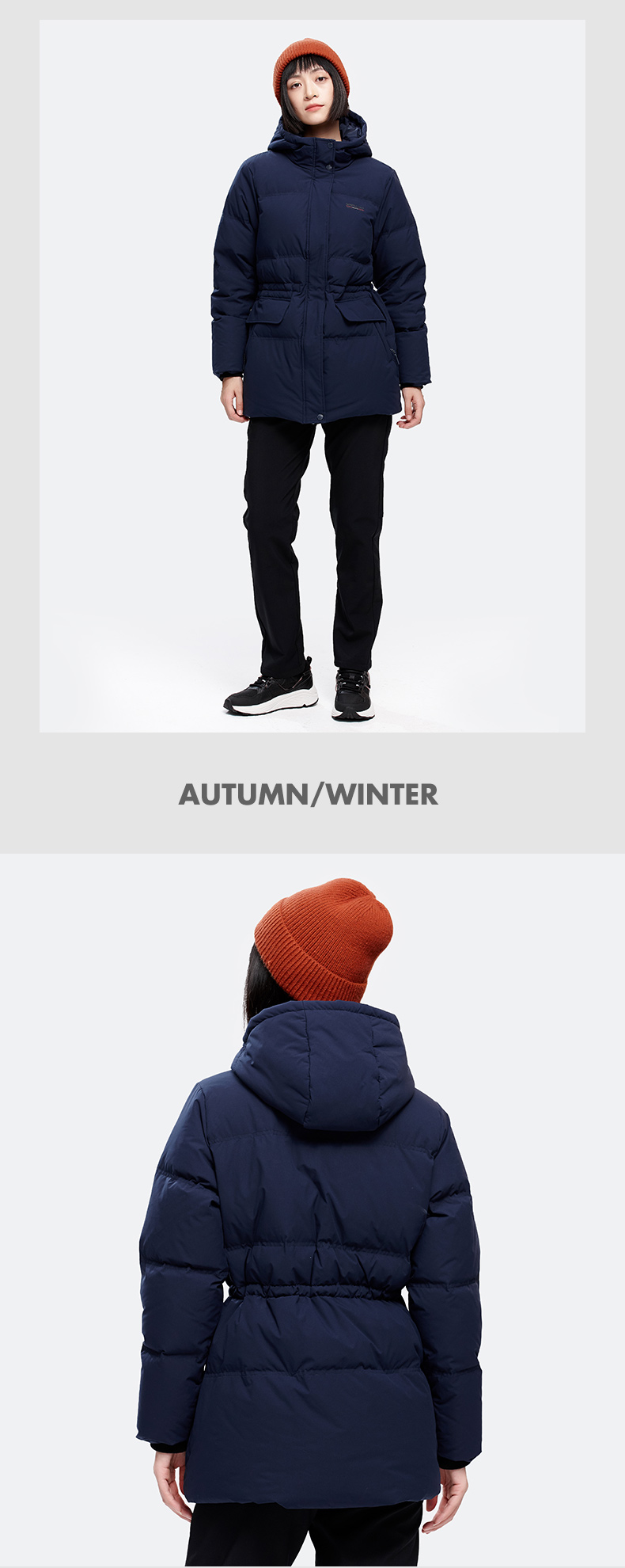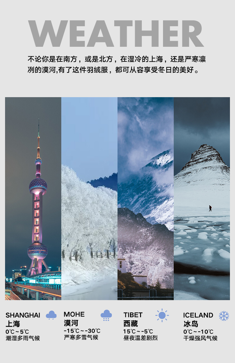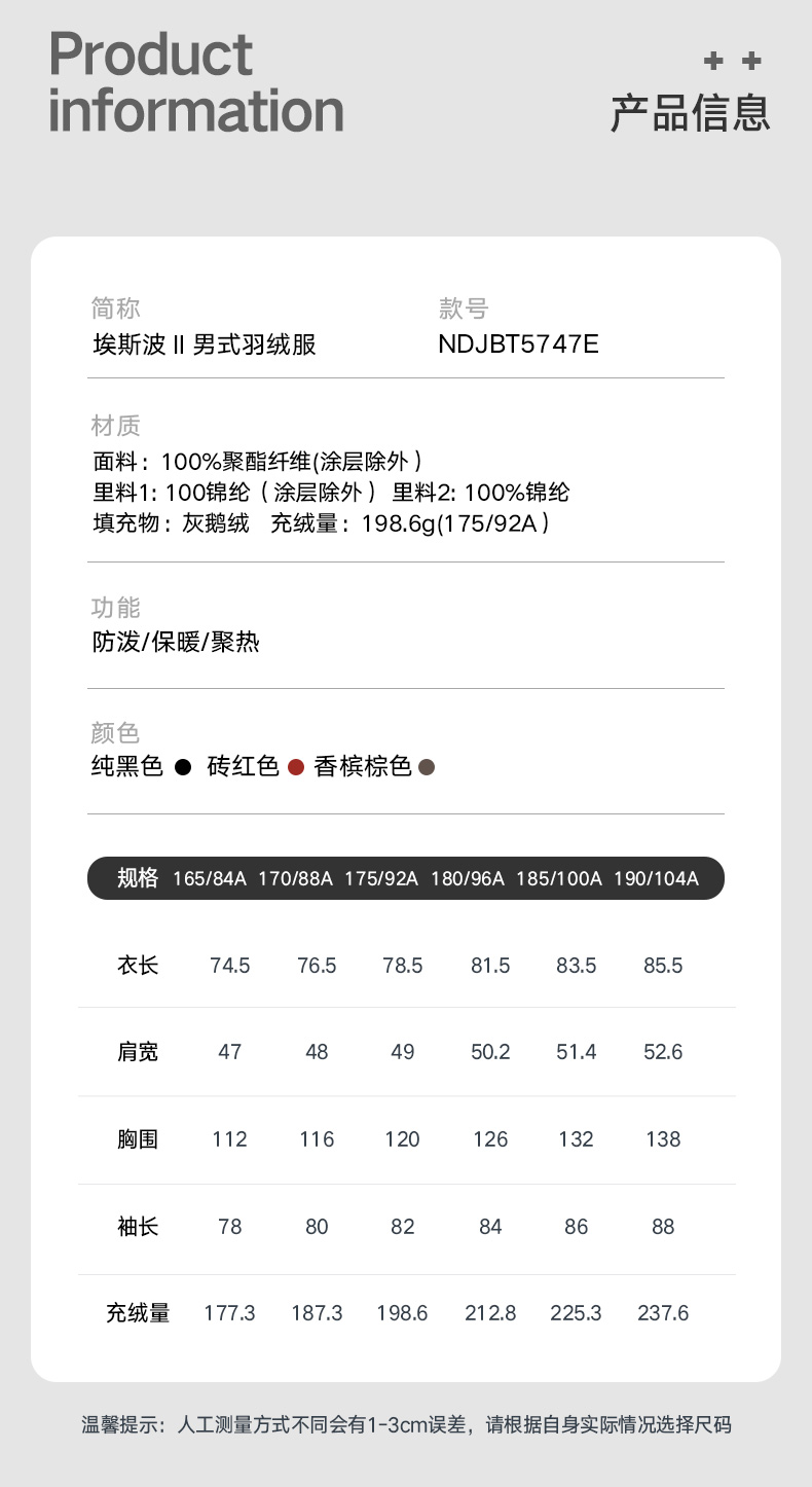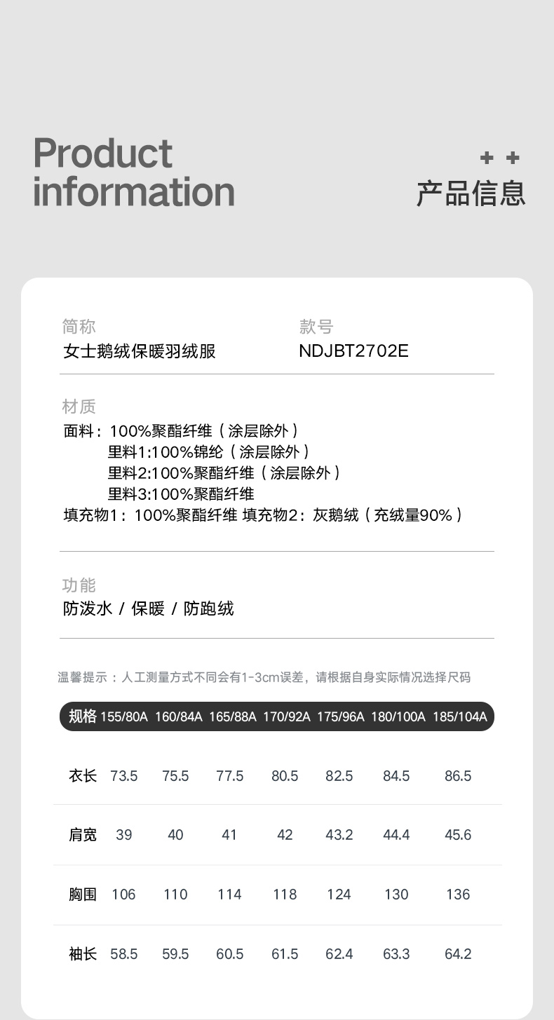 面料拥有防风防泼水功能,4层锁绒工艺:面布、双层胆布、高密里布和德国防绒针,有效防止钻绒,接近0跑绒。细节方面,全身全部采用日本高品质YKK拉链,提拉顺畅;高领连帽设计,防止冷风灌入,细节精致到位。简约纯色款式,百搭穿着。
