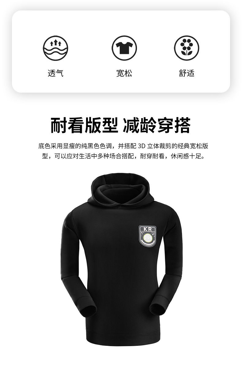 衣面底色是显瘦的纯黑色色调,搭配经典连帽套头卫衣款式,可以应对生活中多种场合搭配,耐穿耐看,休闲感十足。简约百搭。