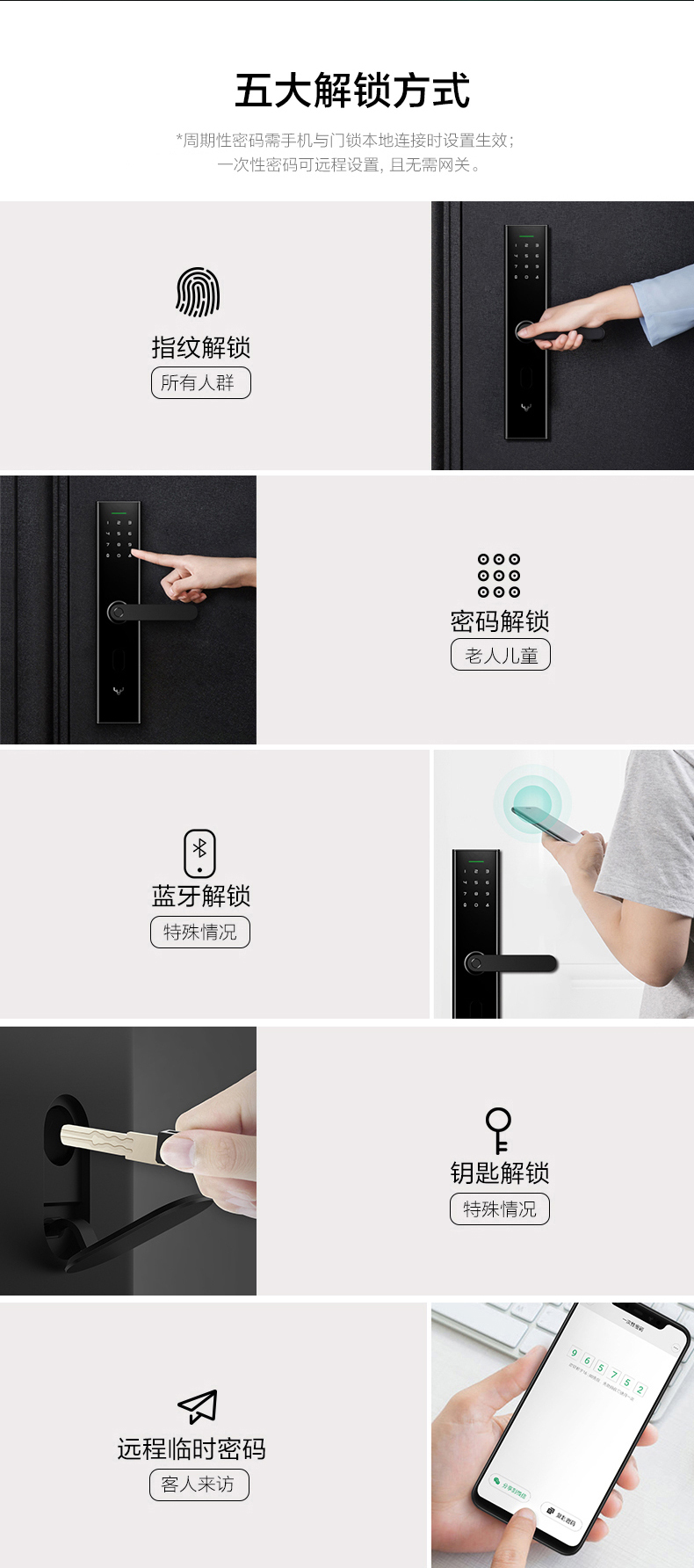 4、有指纹、手机APP(蓝牙)、密码、机械钥匙(备用)