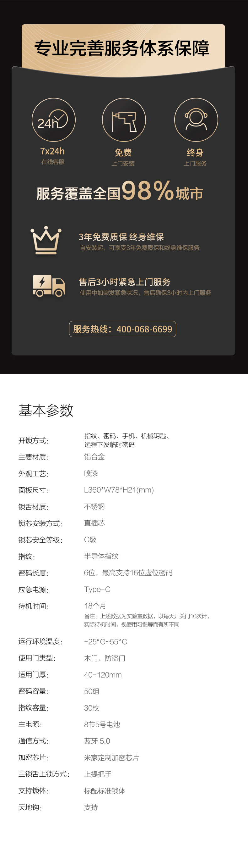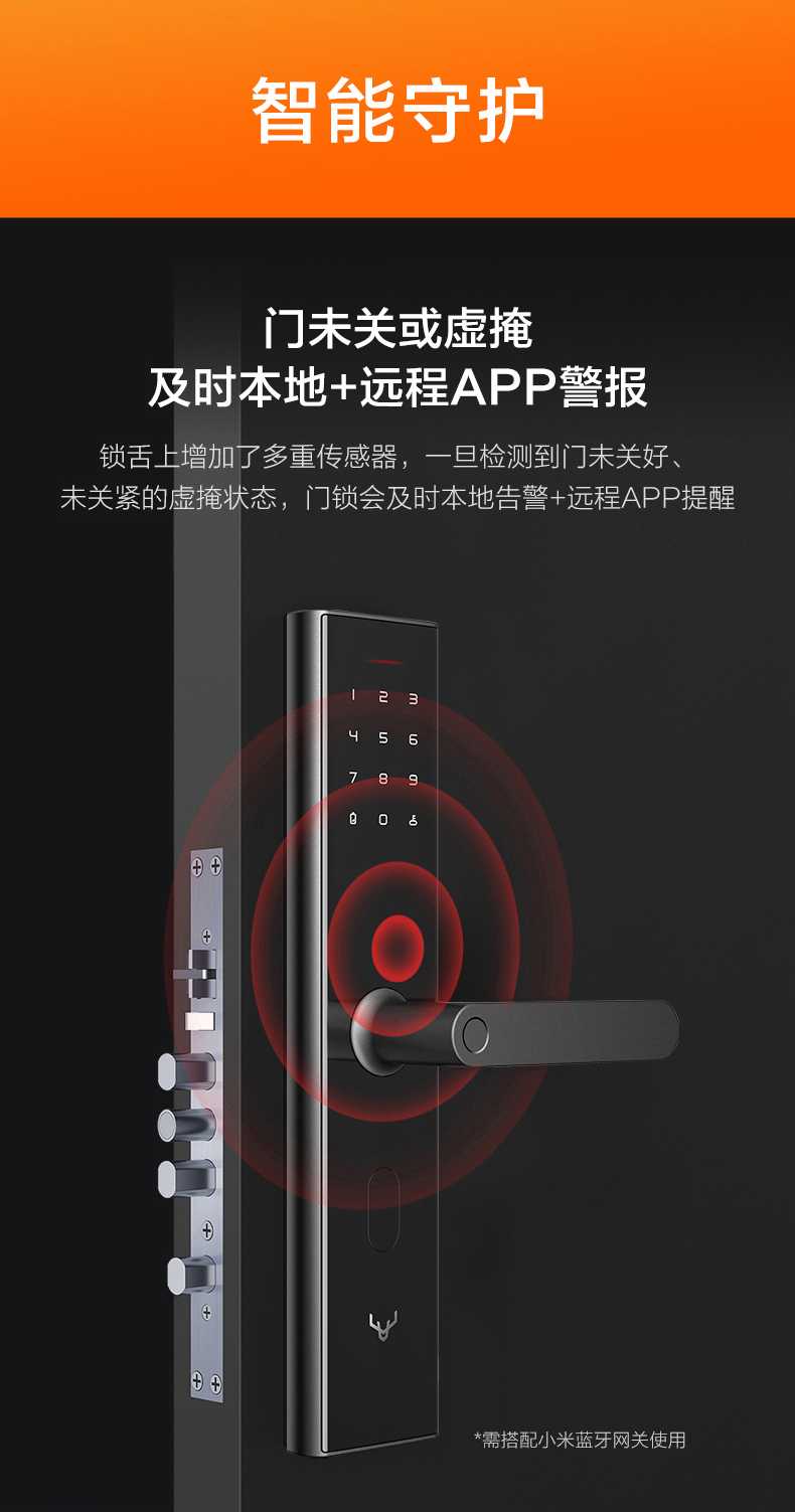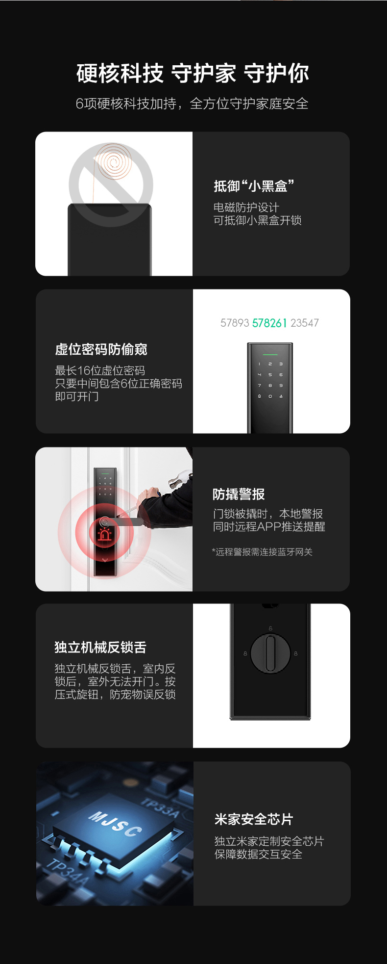搭载小米之家安全芯片,AI黑科技管家,关门自动上锁,五重安全传感器,指纹识别模组升级,锁端信息加密保护,免费上门安装。