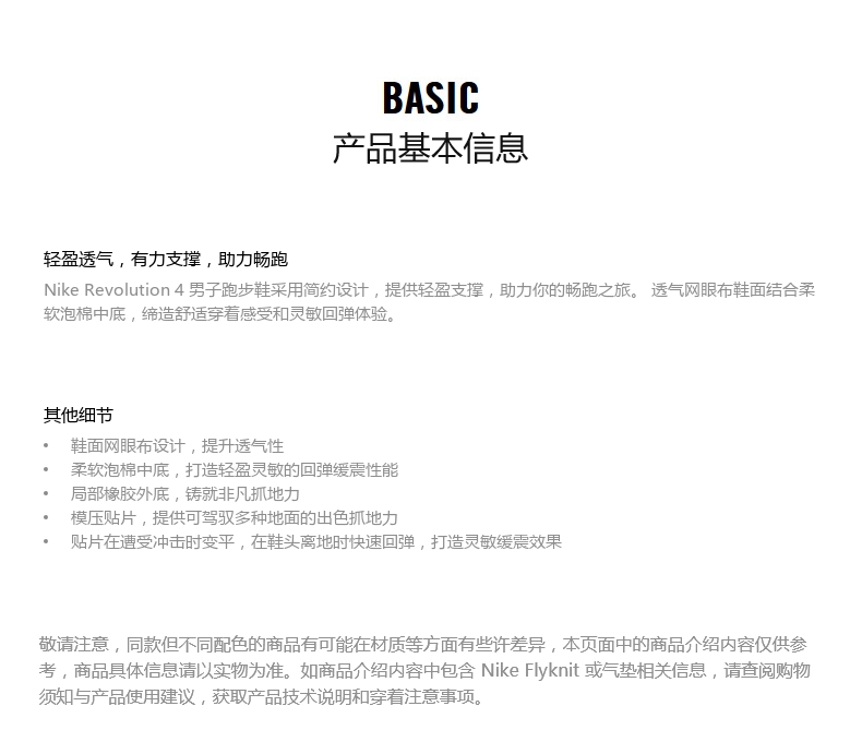 这款Nike Revolution 4男子跑步鞋,采用简约设计,鞋面是透气网眼布,提升透气性。使用柔软泡棉中底,打造轻盈灵敏的回弹缓震性能。