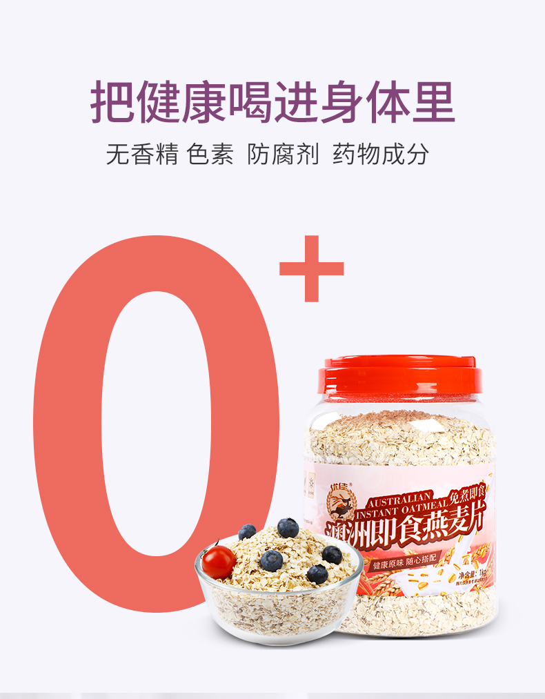 这款优佳纯燕麦片,使用澳洲进口燕麦片,0添加剂成分,无香精、色素、防雾剂,安全健康,高膳食纤维易饱腹,即食冲饮即可。