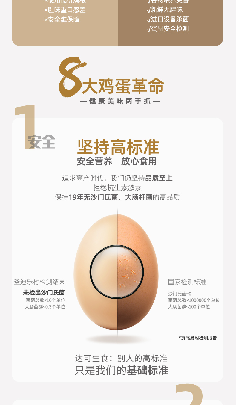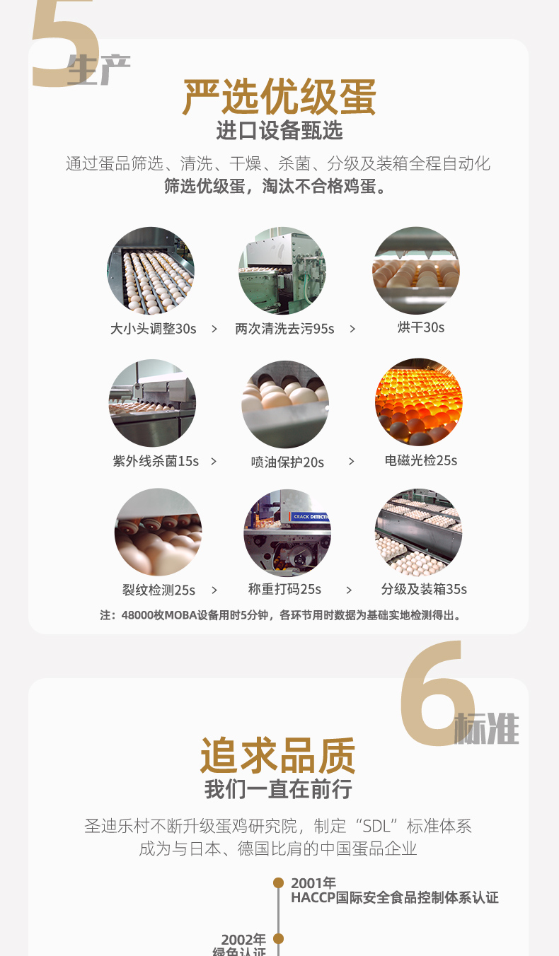 圣迪乐村是国宴峰会指定的蛋品供应商,采用德国罗曼种鸡,谷物喂养,每一个蛋品都可溯源,拒绝使用抗生素激素,同时引进MOBA设备,通过紫外线杀菌,至今未检出沙门氏菌,是放心安全的鲜鸡蛋,达到A级标准。