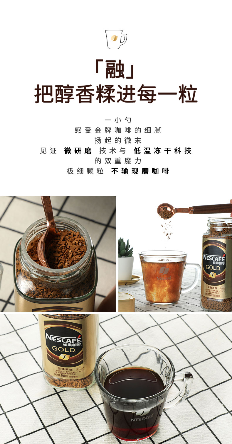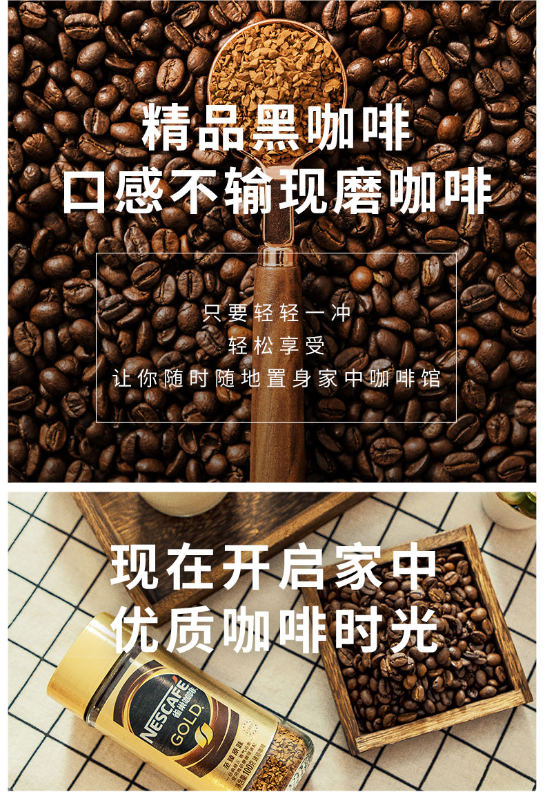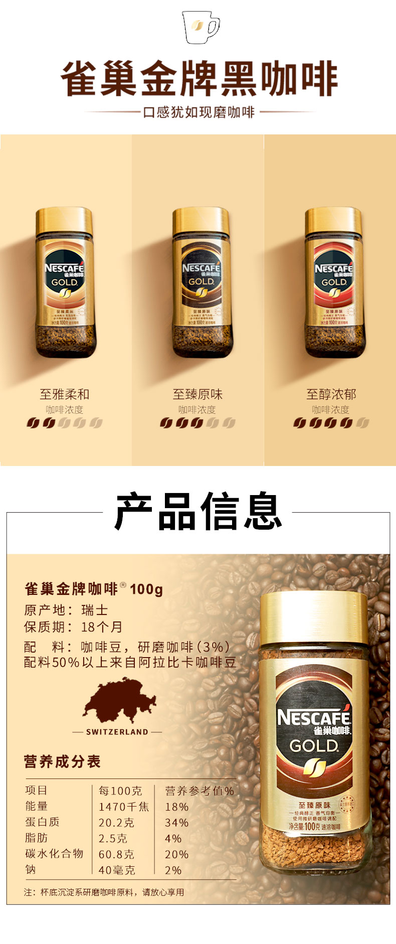 这款雀巢金牌黑咖啡,由瑞士原装进口,雀巢旗舰店发售,100%海外原装正品,盲测口感与现磨咖啡十分相近,不管是味道还是提神力都远超袋装速溶,而且不含植脂末和糖,非常健康。