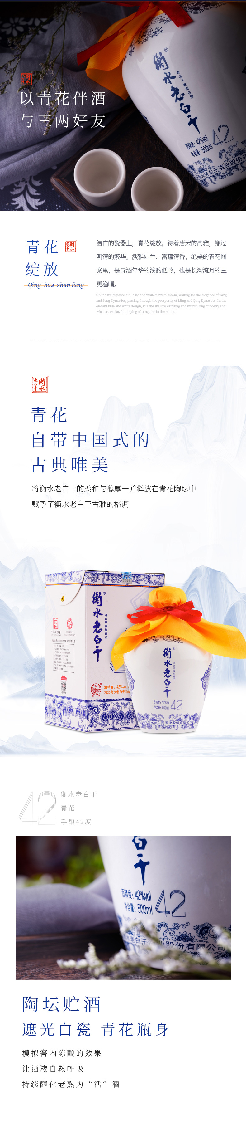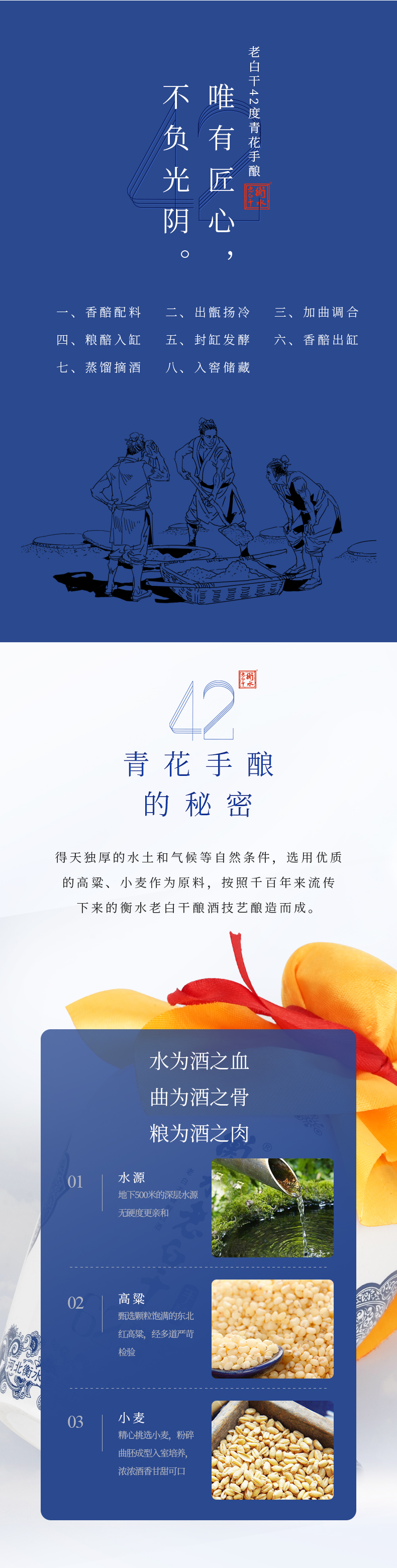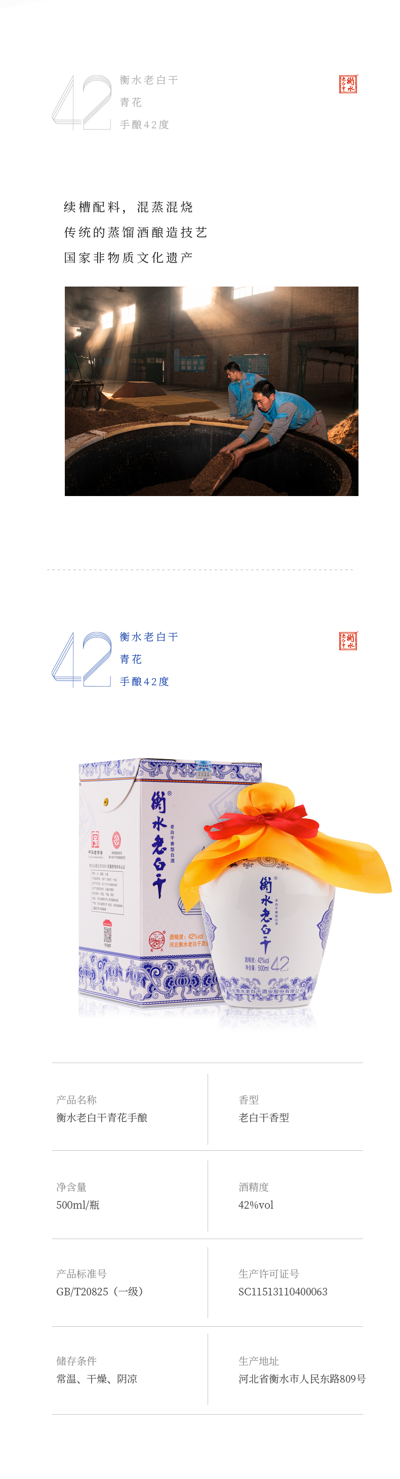 衡水老白干传承千年,口感甘洌清雅。其酿酒工艺,入选国家级非物质文化遗产,地缸发酵,隔绝杂质,杂醇油含量低,饮后不上头。2008年,传统酿造技艺被评选为“国家级非物质文化遗产”,1915年巴拿马万国博览会甲等金奖。2018年拉斯维加斯烈性酒大赛双金奖。