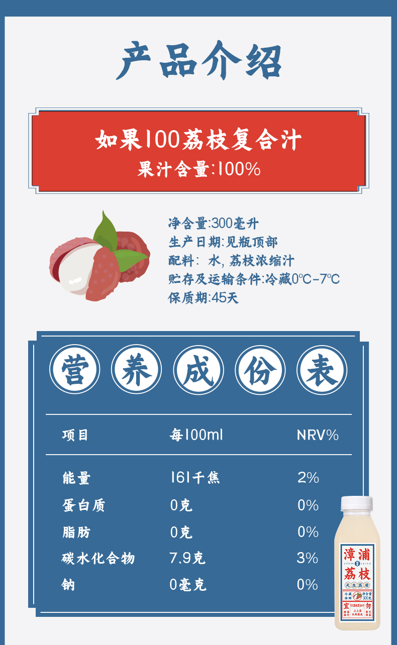 漳浦荔枝夏季童年怀旧饮料,甄选有“荔枝皇后”美誉的漳浦乌石荔枝为原料,明清时代被列为朝廷的贡品,鲜果甜而不腻,味道清香,品质极佳,这款为100%荔枝复合果汁,0色素0蔗糖0香精0脂肪0防腐剂,巴氏杀菌0-7℃保质期45天。