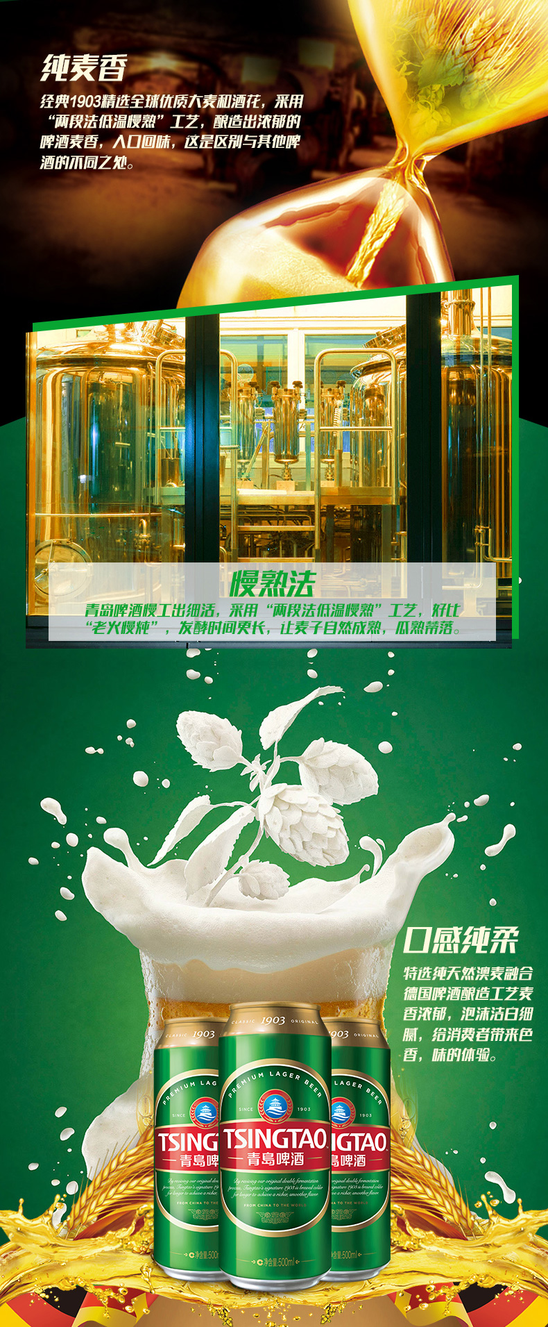 青啤最经典的1903精酿啤酒,沿用1903年经典老方,选用优质加拿大和澳大利亚优质二棱大麦、加上百年酵母,低温慢熟工艺精心慢酿长达28天,充分激活麦芽香味,保留啤酒鲜活口感,酒体沉厚柔和,香醇爽口。