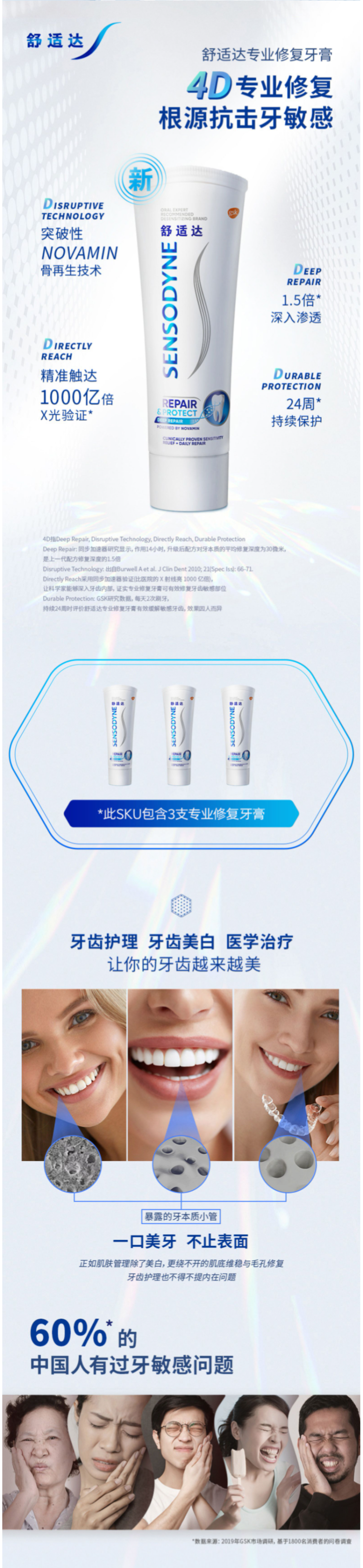 舒适达最贵最有效的抗敏感牙膏,专业修复款,突破性Novamin技术,修复牙本质小洞,从根本上解决牙齿敏感,适合牙齿敏感者日常使用。