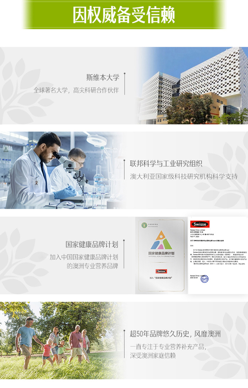 Swiss是近两年风头很盛的自然健康品牌,于1960年在澳大利亚墨尔本创建,号称澳洲顶级保健品,同时也是澳洲自然医学疗法的先驱之一,公司主旨是倡导缔造健康和高品质生活,有超过25年的科学研究和临床试验的基础,其原料采购和生产工艺均通过全球最高处方药的生产标准TGA。